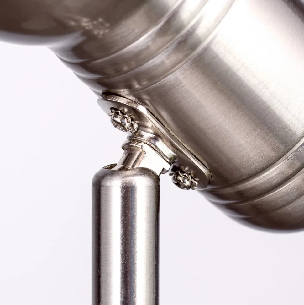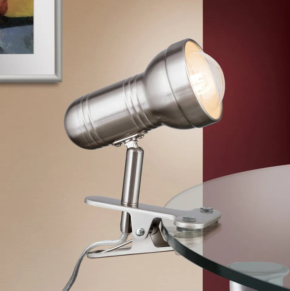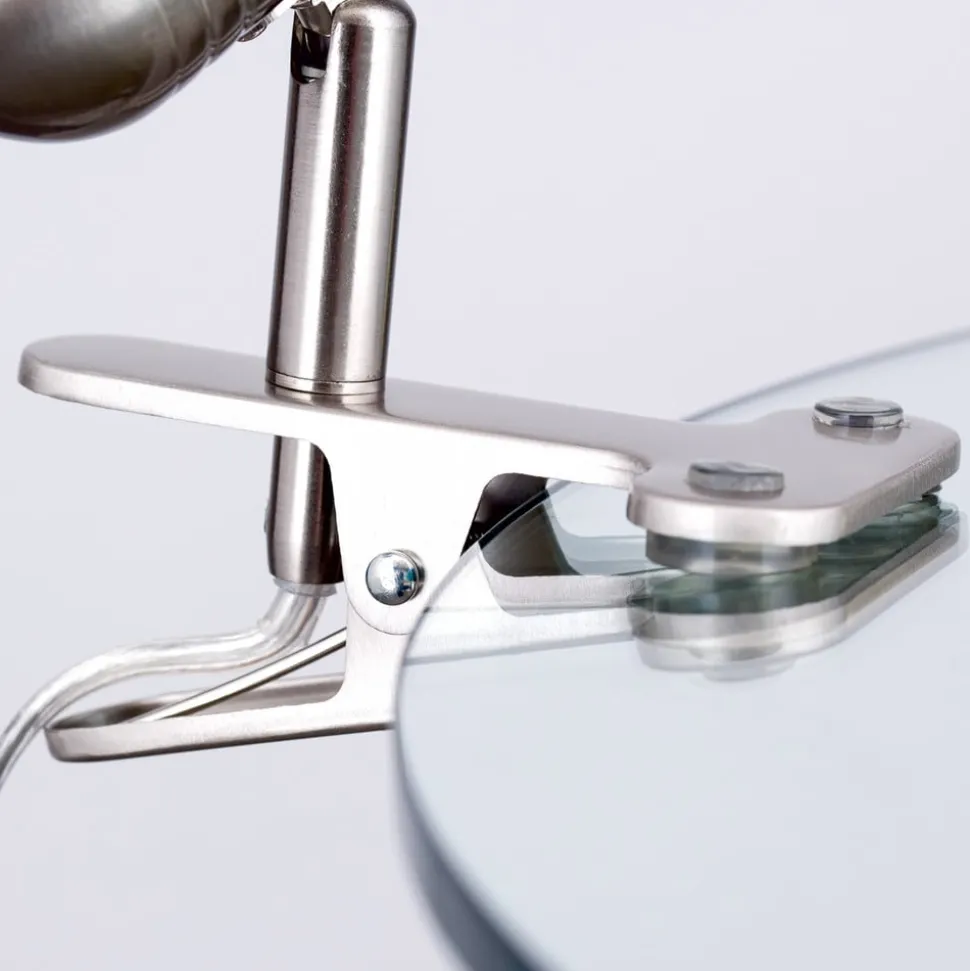 Chique klemlamp Samal, verkrijgbaar in mat messing, satijn en patina. De lamp is met een metalen klem en een kogelscharnier uitgerust en kan op de gekste plekken worden bevestigd.