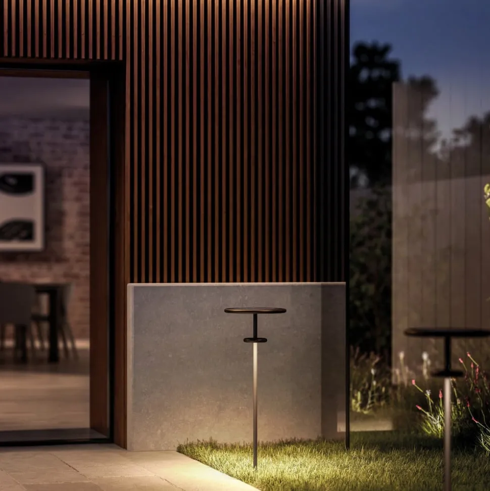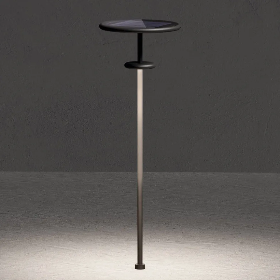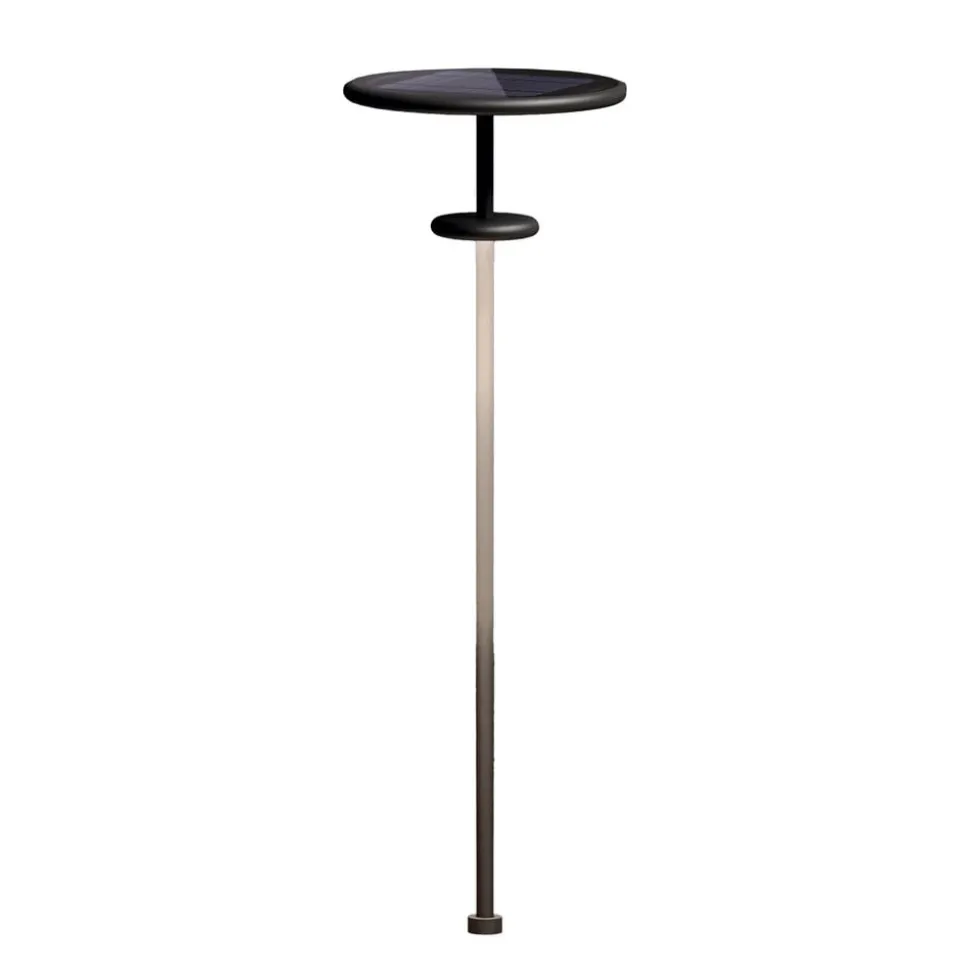 De PLANET B LED lamp op zonne-energie met grondspies zorgt voor aangename extra verlichting in tuinen en groene ruimtes in het donker – volledig autonoom dankzij het zonnepaneel, de oplaadbare batterij en de schemersensor. Het bovenste deel is verdeeld in twee ronde elementen van antracietkleurig aluminium; het bovenste bevat het zonnepaneel, het onderste de LED-unit.