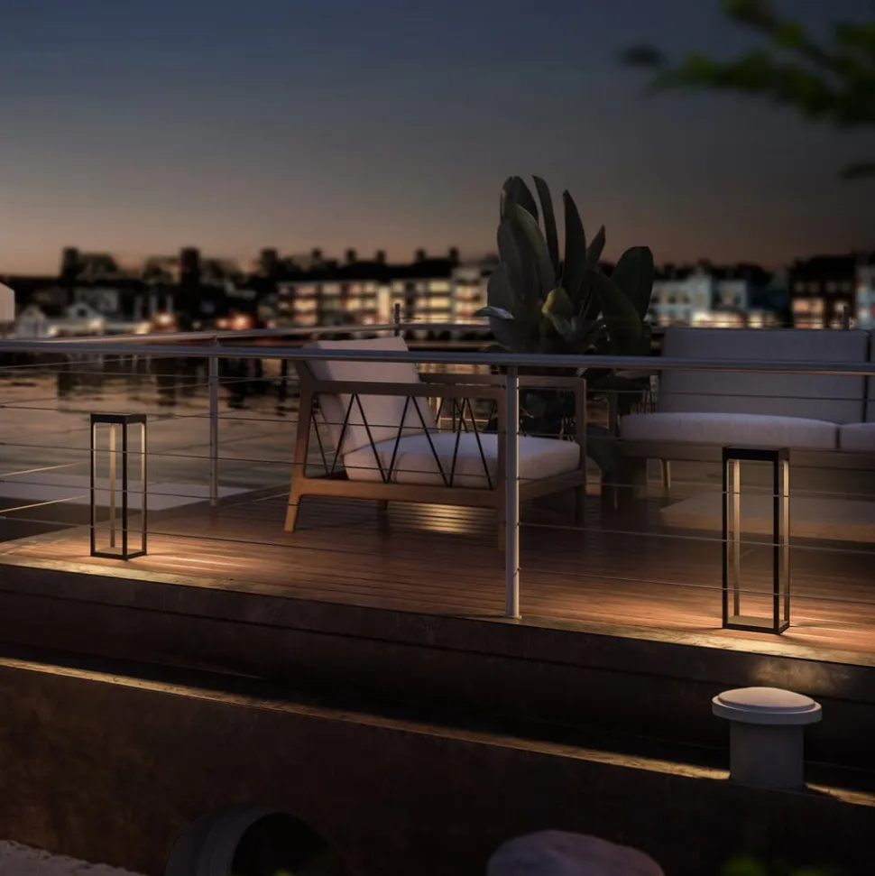 RADIA MAXI LED lamp op zonne-energie in een moderne lantaarnvorm voor terrassen en tuinen De RADIA MAXI LED lamp op zonne-energie brengt aantrekkelijke lichtaccenten in uw buitenruimte – als terraslamp of tuinlamp. De lamp is gemaakt van antraciet aluminium in een hoekige lantaarnvorm en straalt warmwit licht naar beneden. Dankzij het zonnepaneel, de oplaadbare batterij en de schemersensor is de bediening volledig autonoom – Daglichtsensor voor automatisch in- en uitschakelen bij 50 lux – UV-bestendige poedercoating – Roestvrijstalen schroeven – Oplaadtijd: 8 – 10 uur – Bedrijfstijd: 23 – 25 uur – Vervangbare oplaadbare batterij – Oplaadindicator – Zonnepaneel: 4,5 W monokristallijn, gehard glazen afdekking