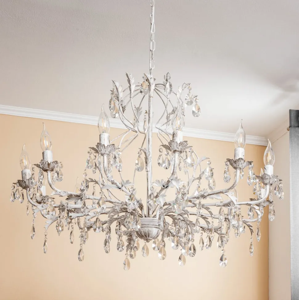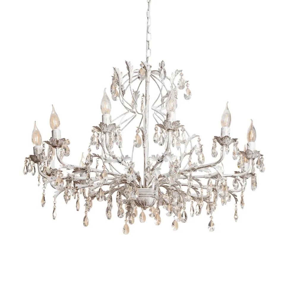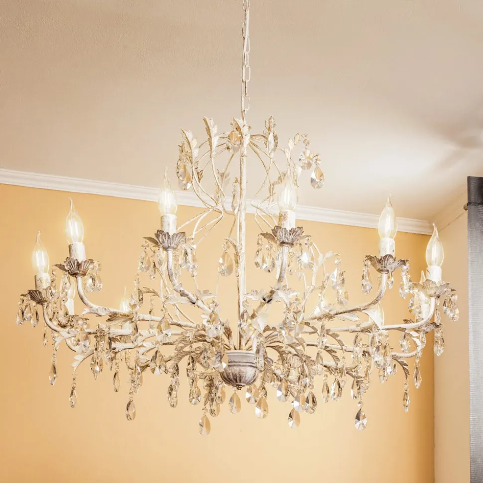 De kristallen kroonluchter Teresa combineert een antieke stijl met moderne functionaliteit en is gemaakt van hoogwaardig gesmeed ijzer en sprankelend K9-kristalglas. Deze luxueuze verlichtingsoplossing is uitgevoerd in de kleuren ivoor, goud en helder en geeft elke woon- of eetkamer een ongeëvenaarde elegantie. De twaalf vlammen van de kroonluchter zorgen voor een indrukwekkend lichteffect dat zowel een gezellige als inspirerende sfeer creëert.