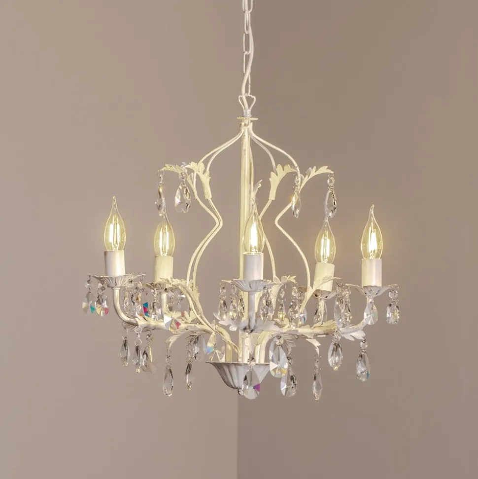 De kristallen kroonluchter Teresa valt op door zijn antieke stijl en het gebruik van hoogwaardig gesmeed ijzer en K9-kristalglas. Het ivoorkleurige oppervlak, gecombineerd met gouden accenten en heldere kristallen, geeft elke ruimte een luxe en tijdloze sfeer. De vijf vlammen van de kroonluchter zorgen voor een gelijkmatige en indrukwekkende verlichting, die zowel in de woonkamer als in de eetkamer perfect tot zijn recht komt.