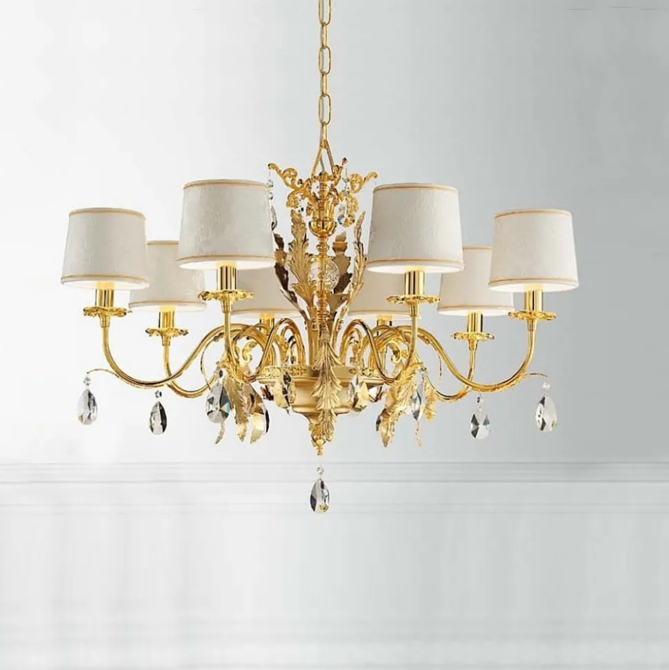 Deze stijlvolle kroonluchter maakt de schoonheid van het verleden zichtbaar en voelbaar. Luxueuze versieringen en elegant gebogen vormen geven samen een bijzonder stijlvol beeld, dat ook heden ten dage allerlei ruimtes siert. De aandacht wordt eerst getrokken door het prachtige frame met zijn licht gebogen armen dat de indruk wekt door zachte veren omgeven te zijn en daardoor het klassiek-antieke karakter onderstreept. Witte kappen van fraai damast met een goudkleurige band zorgen daarbij voor aangenaam, huiselijk licht in de omgeving, terwijl de Asfour kristallen aantrekkelijke accenten aanbrengen.