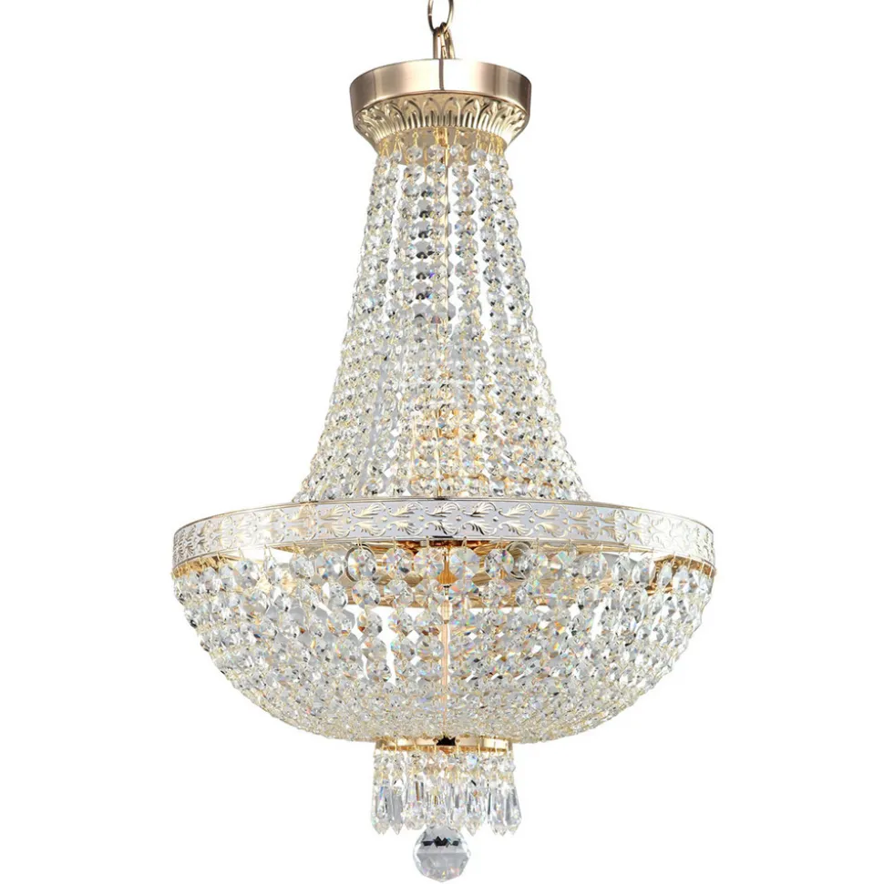 Bella kroonluchter: stralend mooie verlichting voor een feestelijke ambianceMet deze fantastisch vormgegeven kroonluchter weet je niet wat je het eerst moet bewonderen: het metalen frame met de warme goudkleurige coating, de omringende gepatineerde messing band met de fijne ornamenten of de ontelbare, verschillend geslepen kristallen in verschillende vormen en maten?De Bella kroonluchter is een totaalkunstwerk dat in onverlichte toestand een grandioze indruk maakt, maar zijn feestelijke uitstraling pas ten volle ontplooit zodra het licht wordt ingeschakeld en dan zowel de warme glans van de metalen vergulding benadrukt als de kristallen intens laat fonkelen.