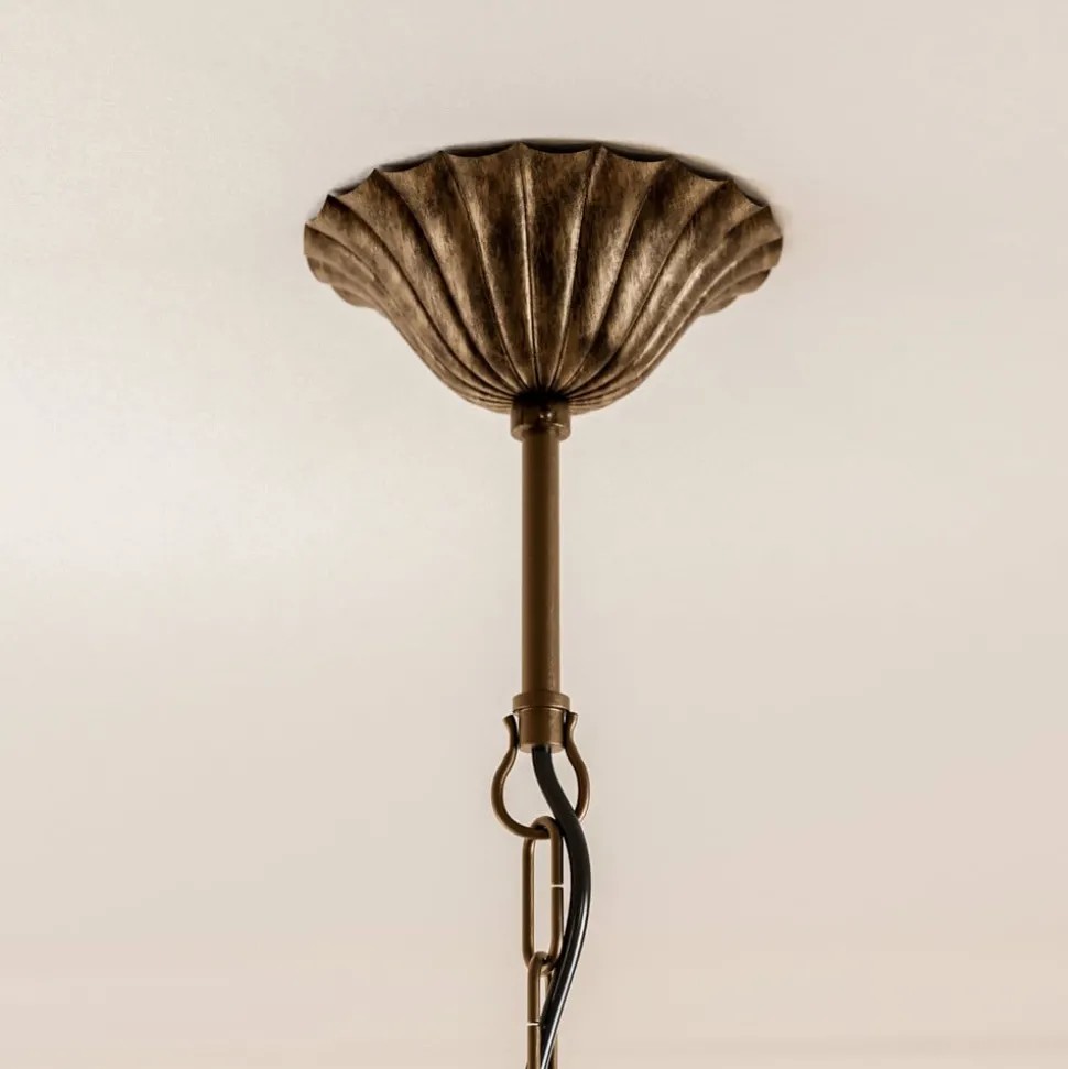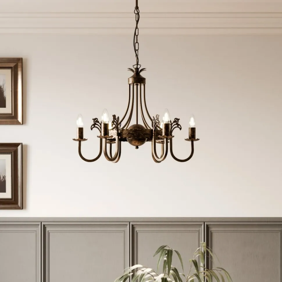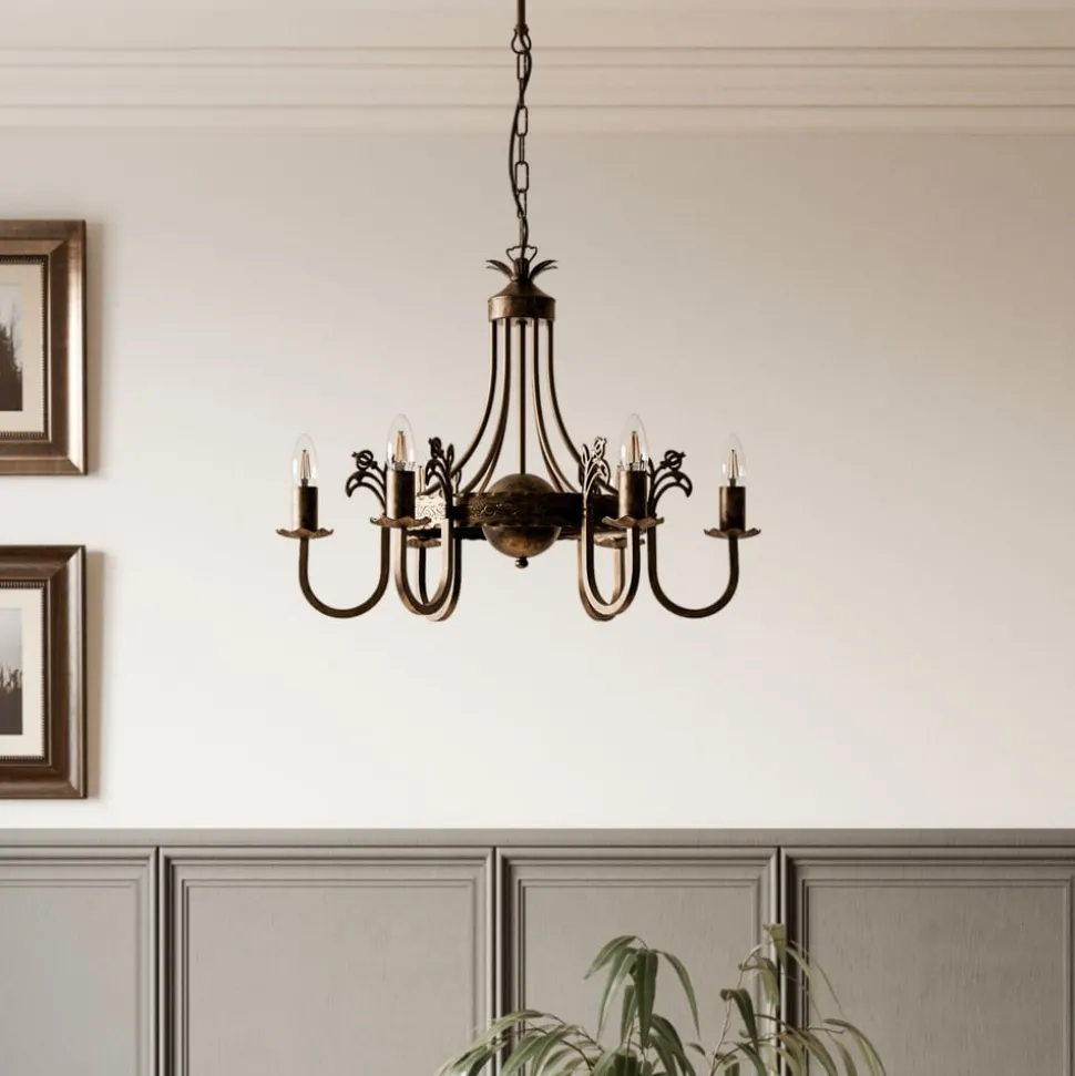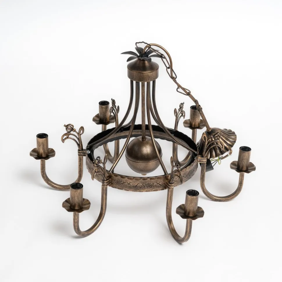 De kroonluchter Castle maakt indruk door zijn antieke design en de hoogwaardige afwerking van metaal. De donker gepatineerde messingkleur geeft de kroonluchter een tijdloze elegantie, die zowel in de woonkamer als in de eetkamer voor een stijlvolle sfeer zorgt. Met zijn zes vlammen biedt hij een royale lichtbron, die elke ruimte in een warm en uitnodigend licht dompelt.