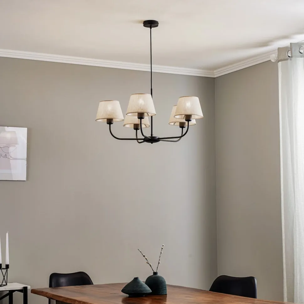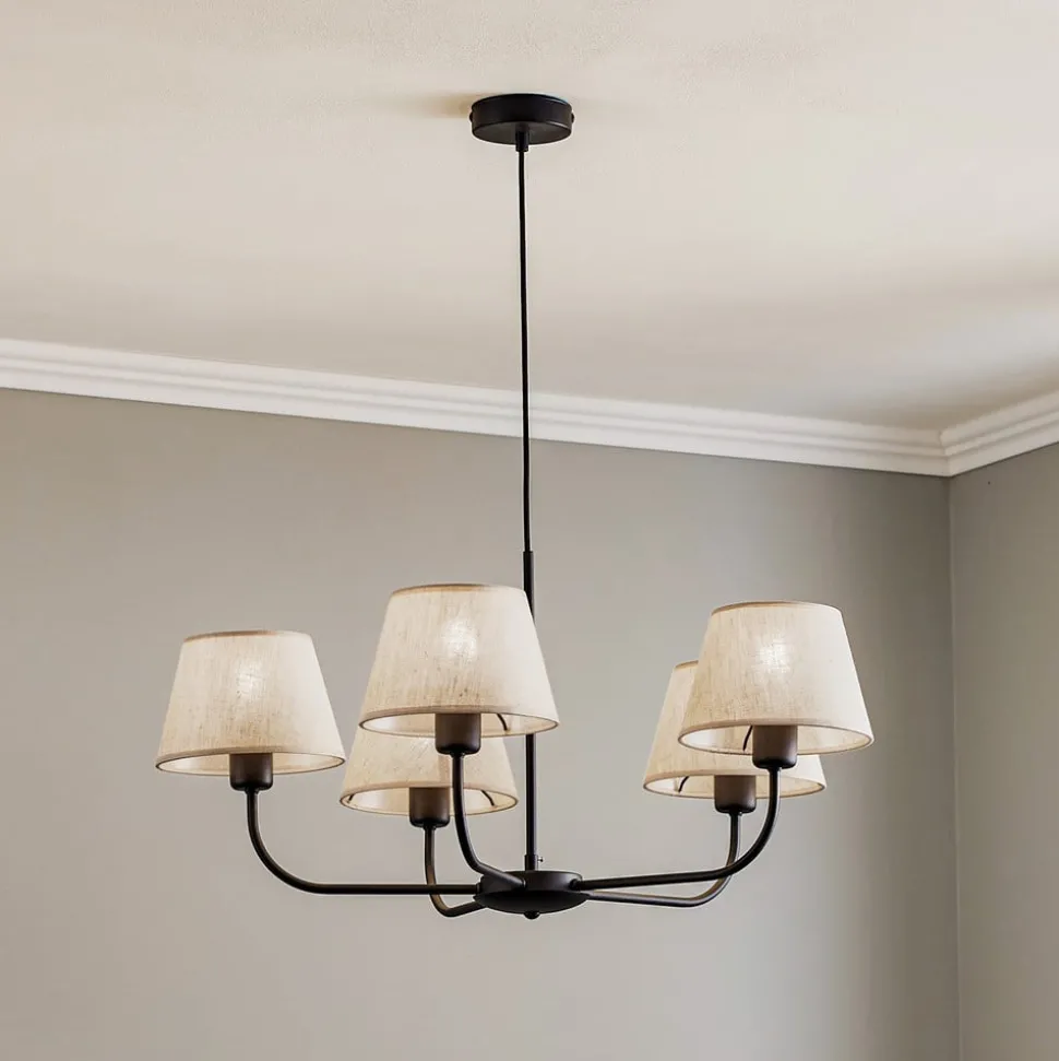 De kroonluchter Chicago combineert tijdloze elegantie met functionele veelzijdigheid. Dit verlichtingselement is gemaakt van hoogwaardig metaal, linnen en kunststof en past naadloos in verschillende interieurstijlen. De vijf linnen lampenkappen in de kleuren zwart en naturel zorgen voor een harmonieus lichtspel dat zowel in de woonkamer als in de eetkamer een aangename sfeer creëert. Dankzij de dimbaarheid via een externe dimmer kan de lichtintensiteit individueel worden aangepast om zo de gewenste sfeer te creëren.