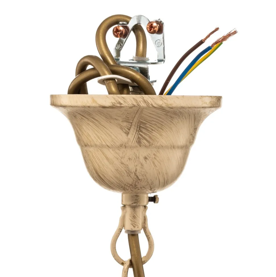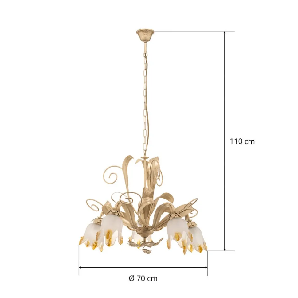 De kroonluchter Elena in Florentijnse stijl combineert klassieke elegantie met hoogwaardig vakmanschap. Hij is gemaakt van edel ijzer en glas en straalt in een aantrekkelijke goud-antieke en witte kleur. Deze combinatie geeft elke ruimte, of het nu de woonkamer of eetkamer is, een onmiskenbare sfeer. De vijf lampen van de kroonluchter zorgen voor een gelijkmatige en sfeervolle verlichting, die zowel gezellige als inspirerende momenten creëert.