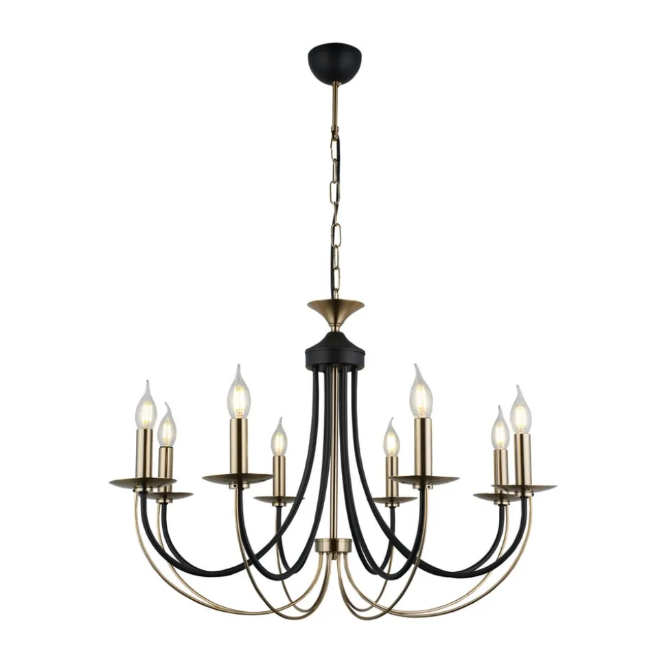 De kroonluchter Ferra combineert antieke charme met moderne functionaliteit en wordt zo een blikvanger in elke woon- of eetkamer. Hij is gemaakt van hoogwaardig metaal in een elegante antiek messing en zwarte kleur en straalt een tijdloze elegantie uit. Met zijn acht armatuuren zorgt hij voor een gelijkmatige en indrukwekkende verlichting van de ruimte en creëert hij een sfeer die zowel geschikt is voor gezellige avonden als voor feestelijke gelegenheden.