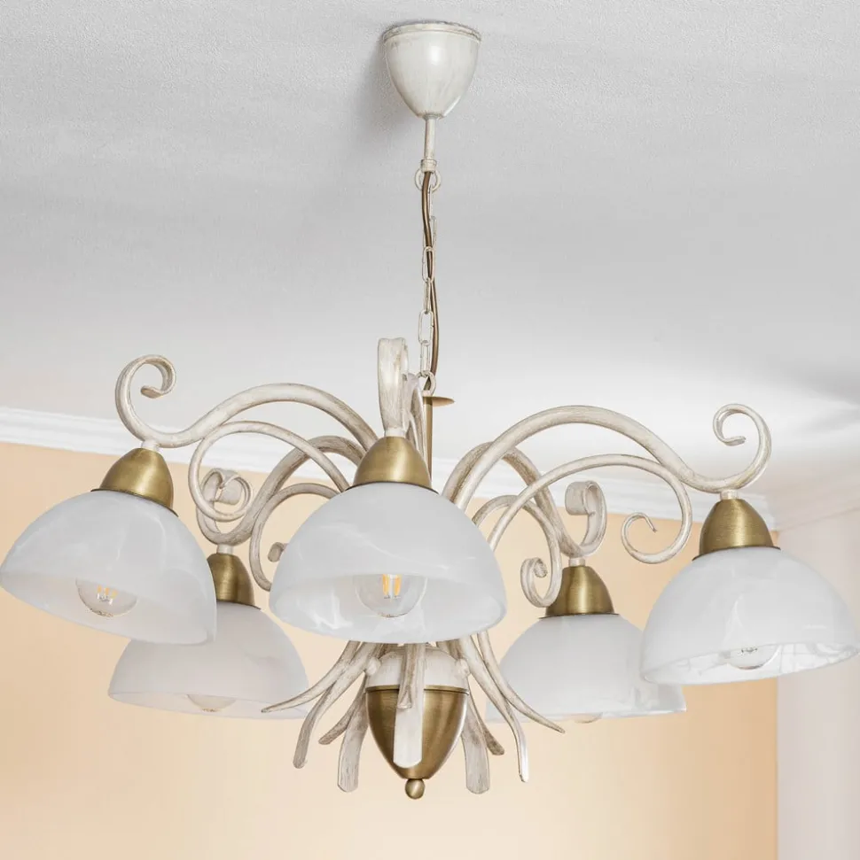 De kroonluchter Flora combineert rustieke charme met tijdloze elegantie en wordt zo een stijlvol hoogtepunt in elke woon- of eetkamer. Hij is gemaakt van hoogwaardig glas en robuust staal en valt op door zijn harmonieuze kleurstelling in wit, satijnglans en edel messing. De vijf kunstig vormgegeven glazen kappen zorgen voor een gelijkmatige en aangename lichtverspreiding, die elke ruimte in een uitnodigende sfeer dompelt.