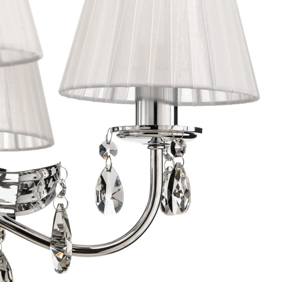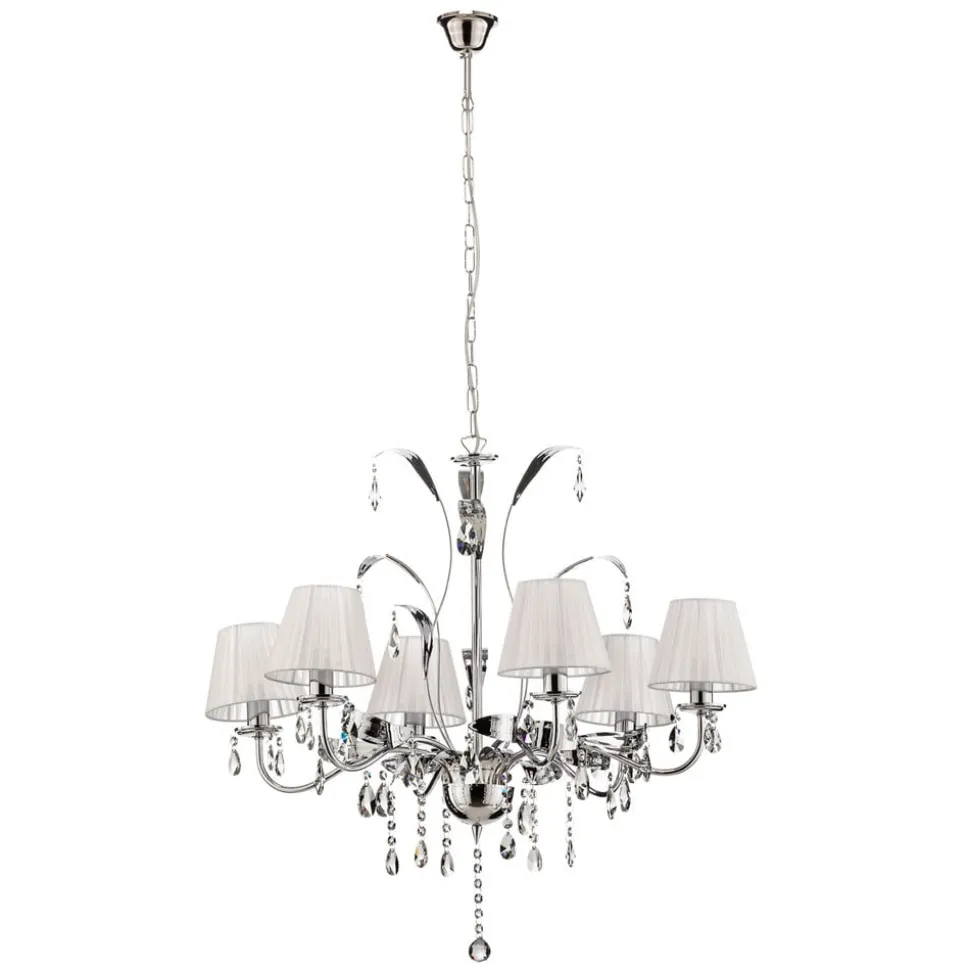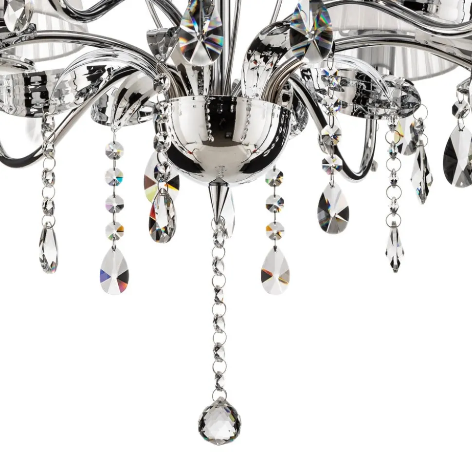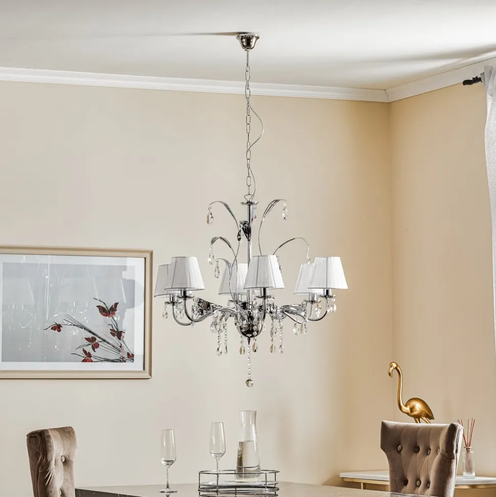 De kroonluchter Jacqueline maakt indruk door zijn verfijnde combinatie van ijzer, stof en hoogwaardig K9-kristalglas. De 6-lamps constructie zorgt voor een gelijkmatige en aangename lichtverdeling, die zowel in de woonkamer als in de eetkamer een elegante sfeer creëert. De chroom-witte kleurstelling met duidelijke accenten geeft de ruimte een tijdloze esthetiek, die zowel klassieke als moderne interieurstijlen aanvult.