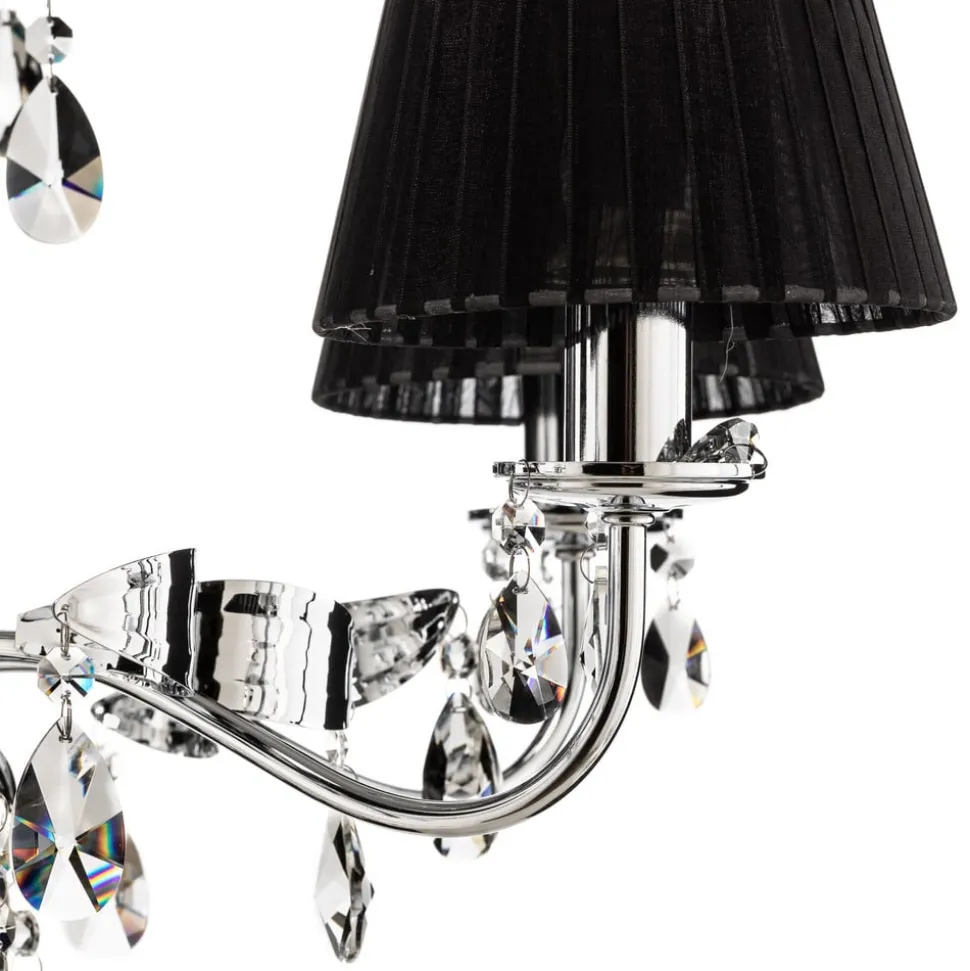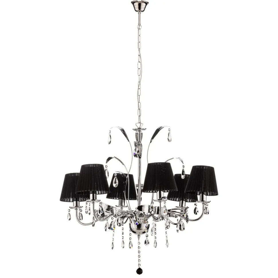 De kroonluchter Jacqueline, 6-lamps, zwart, combineert tijdloze elegantie met moderne veelzijdigheid. Hij is gemaakt van hoogwaardig ijzer, stof en K9-kristalglas en biedt een indrukwekkende combinatie van robuustheid en verfijning. De kleurencombinatie van chroom, zwart en helder geeft de kroonluchter een elegante uitstraling die zowel in de woonkamer als in de eetkamer accenten legt. De zes lichtbronnen zorgen voor een gelijkmatige verlichting en creëren een uitnodigende sfeer.