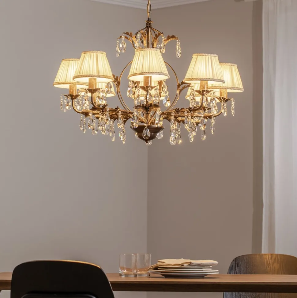 8-lamps kroonluchter Karen in brons met kristallen Deze 8-lamps kroonluchter Karen valt op door zijn antieke charme. Het frame met prachtige bladornamenten en een overvloed aan kristallen is gemaakt van bronskleurig metaal. Elk van de acht fittingen wordt bedekt door een gerimpelde, licht taps toelopende stoffen kap met mooie randen aan de boven- en onderkant, waardoor het licht niet verblindt.