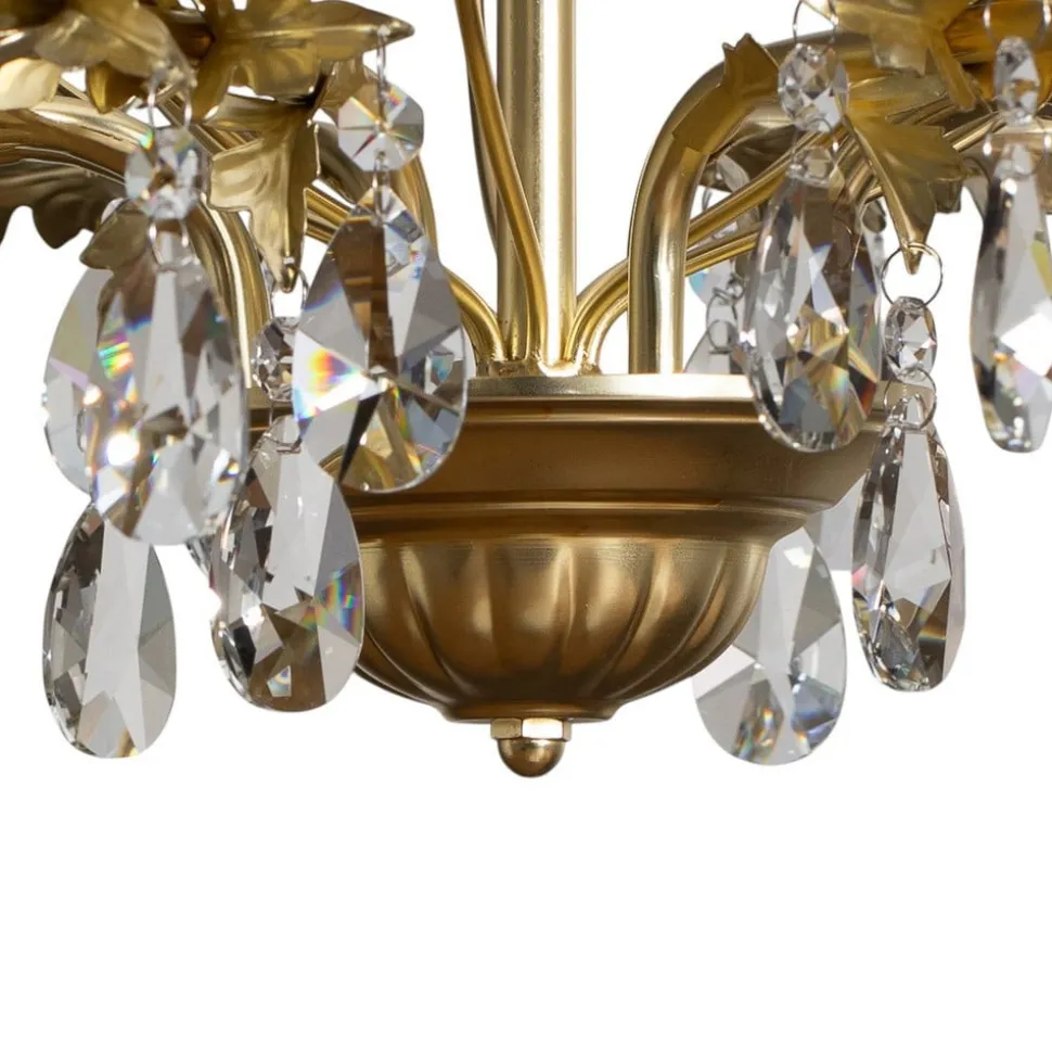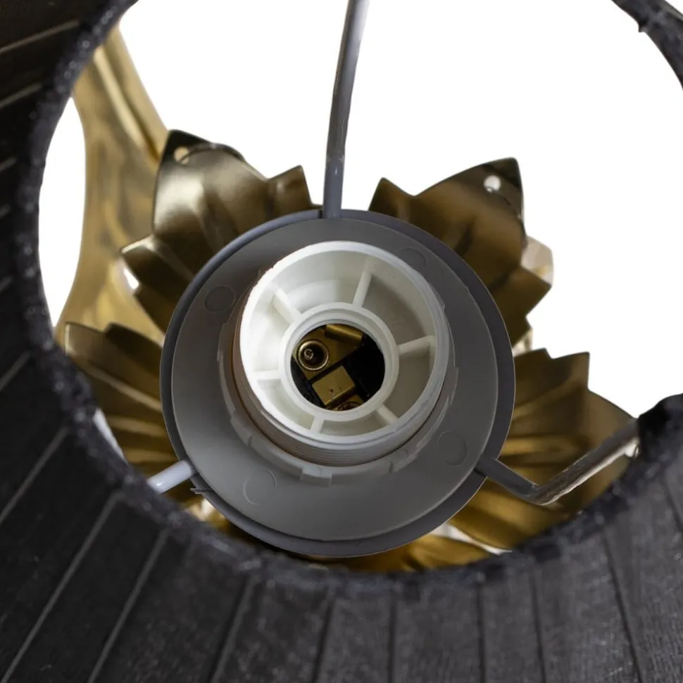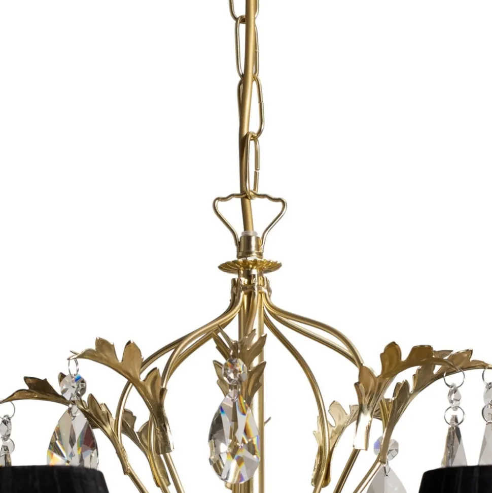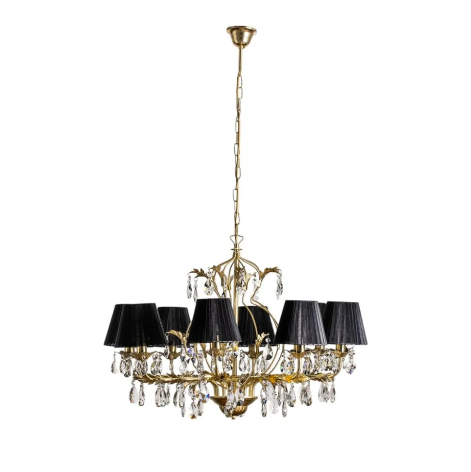8-lamps kroonluchter Karen in goud en zwart Het gebogen metalen frame met acht armen, prachtige bladdecoraties en decoratieve kristallen ophanging heeft een verfijnde gouden afwerking gekregen. In schril contrast hiermee is de kroonluchter voorzien van acht licht transparante kappen van zwarte stof. Deze licht conische kappen verbergen de lampen en zorgen voor niet-verblindend licht en sfeervolle verlichting.