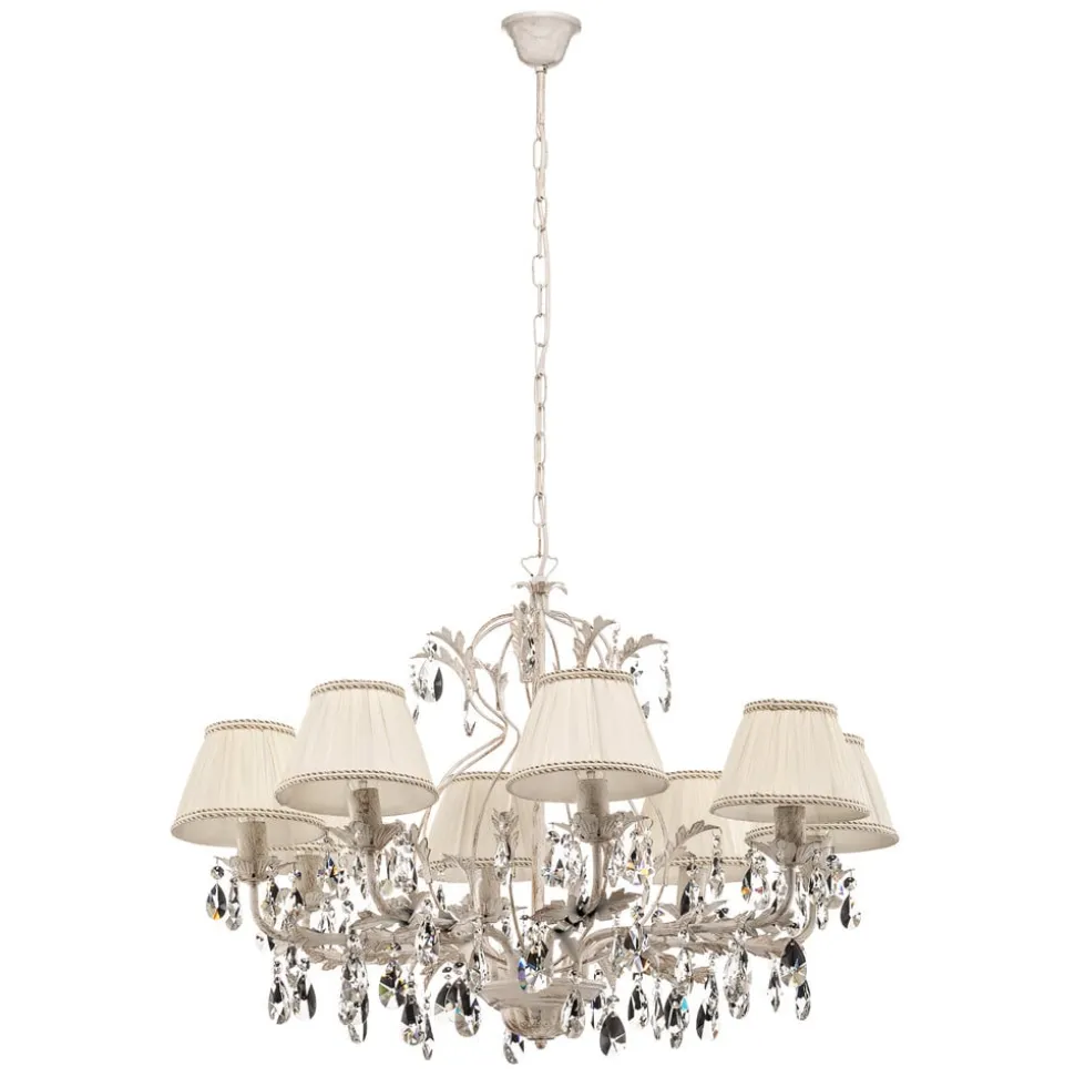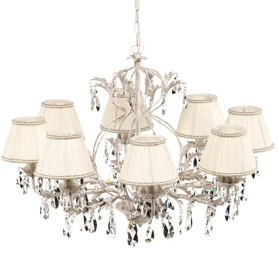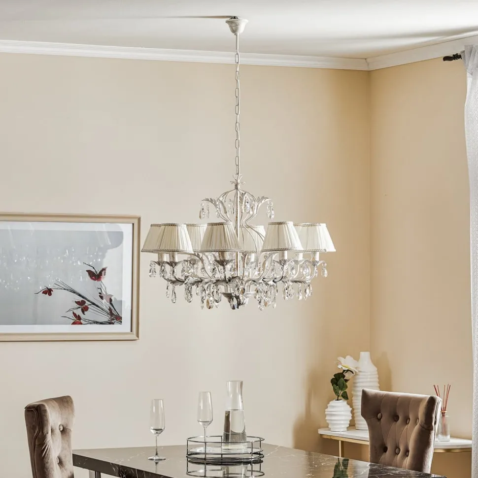 De kroonluchter Karen met 8 lampen in ivoorkleur combineert klassieke elegantie met moderne veelzijdigheid. Dit verlichtingsobject is gemaakt van hoogwaardig ijzer, textiel en sprankelend kristal en zet stijlvolle accenten in woon- en eetkamers en in de hal. De zorgvuldige afwerking en het gebruik van edele materialen geven de kroonluchter een tijdloze uitstraling die elke ruimte opwaardeert.