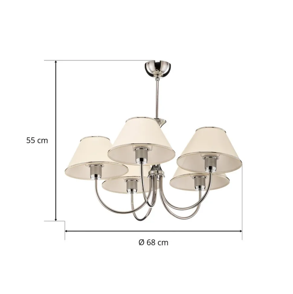 De kroonluchter London combineert tijdloze elegantie met moderne veelzijdigheid en wordt zo een blikvanger in elke woon- of eetkamer. Hij is gemaakt van hoogwaardig metaal en PVC-kunststof en straalt in een aantrekkelijke chroom en crèmewit. De 5-lamps constructie zorgt voor een gelijkmatige en aangename verlichting, die de ruimte in een warme en uitnodigende sfeer dompelt.