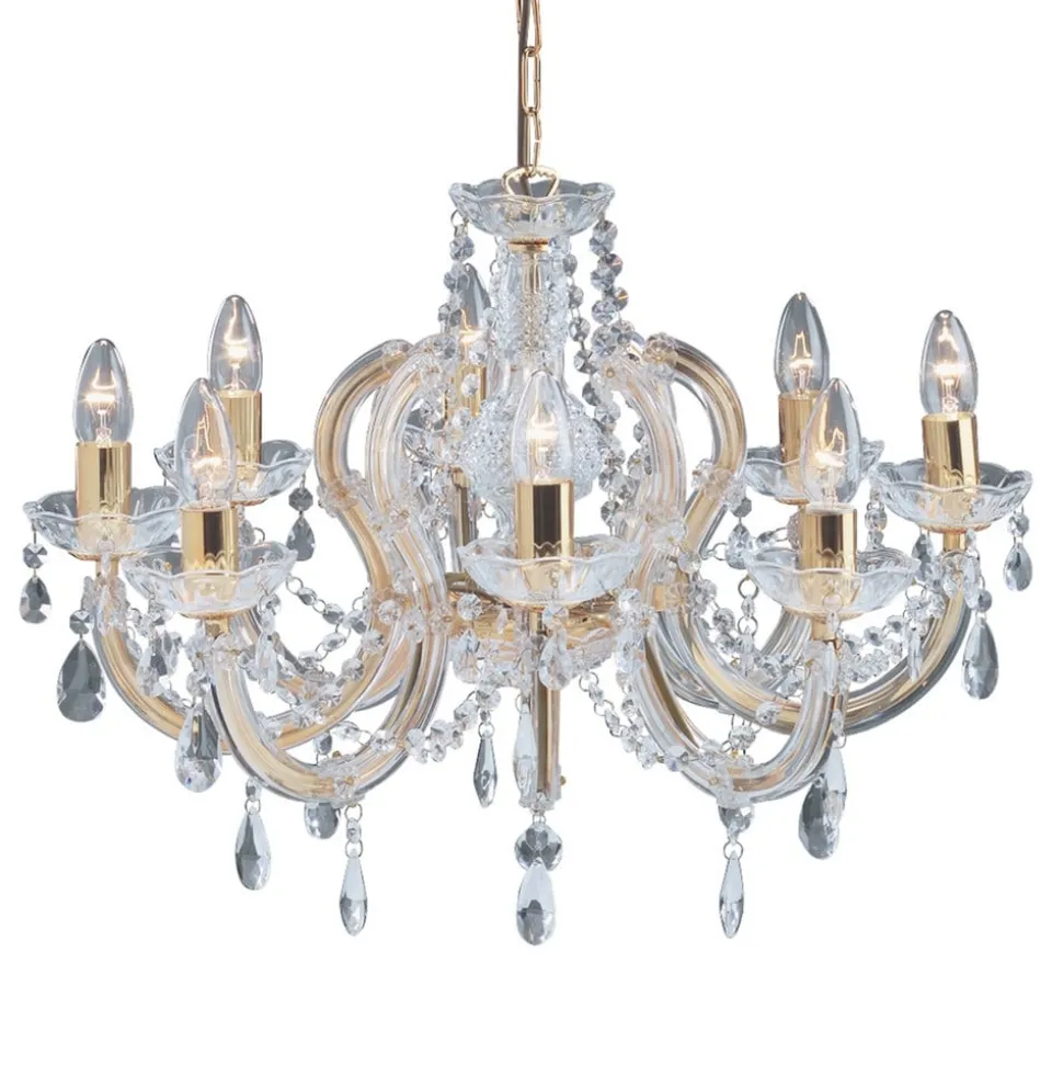 Een kroonluchter, die in een klassiek jasje gehuld is. Gedetailleerd vormgegeven zweven talrijke glaskristallen van het mooie gebogen frame met messing-glanzende metalen elementen. Voor diverse betoverende momenten!