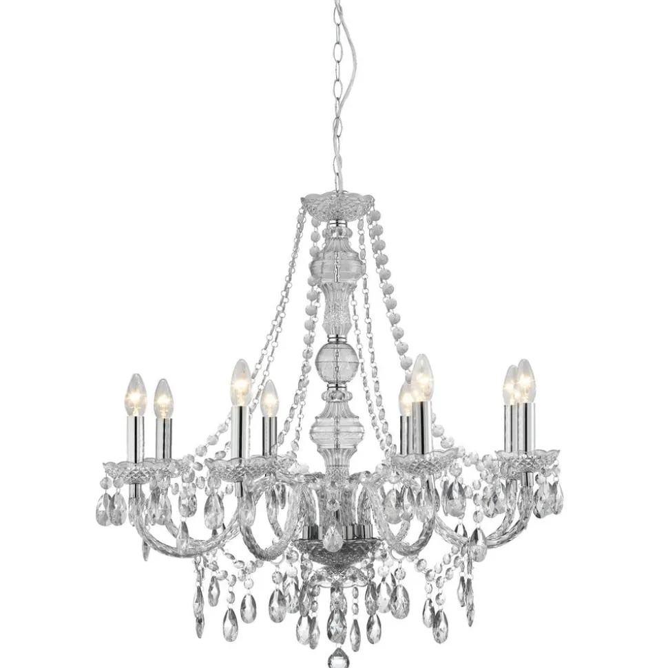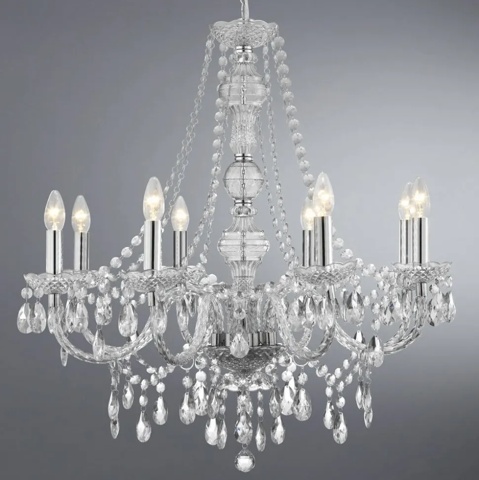 De acht-vlammige kroonluchter Marie Therese is prachtig en statig in zijn combinatie van verchroomd metaal en helder glas. De ophanging van de kroonluchter is gedecoreerd met talrijke glazen elementen en de armen van de lamp zijn eveneens bekleed met helder glas, voorzien van heldere kaarsenplaten en versierd met talrijke kettingen met ronde, platte elementen en druppels geslepen kristalglas.