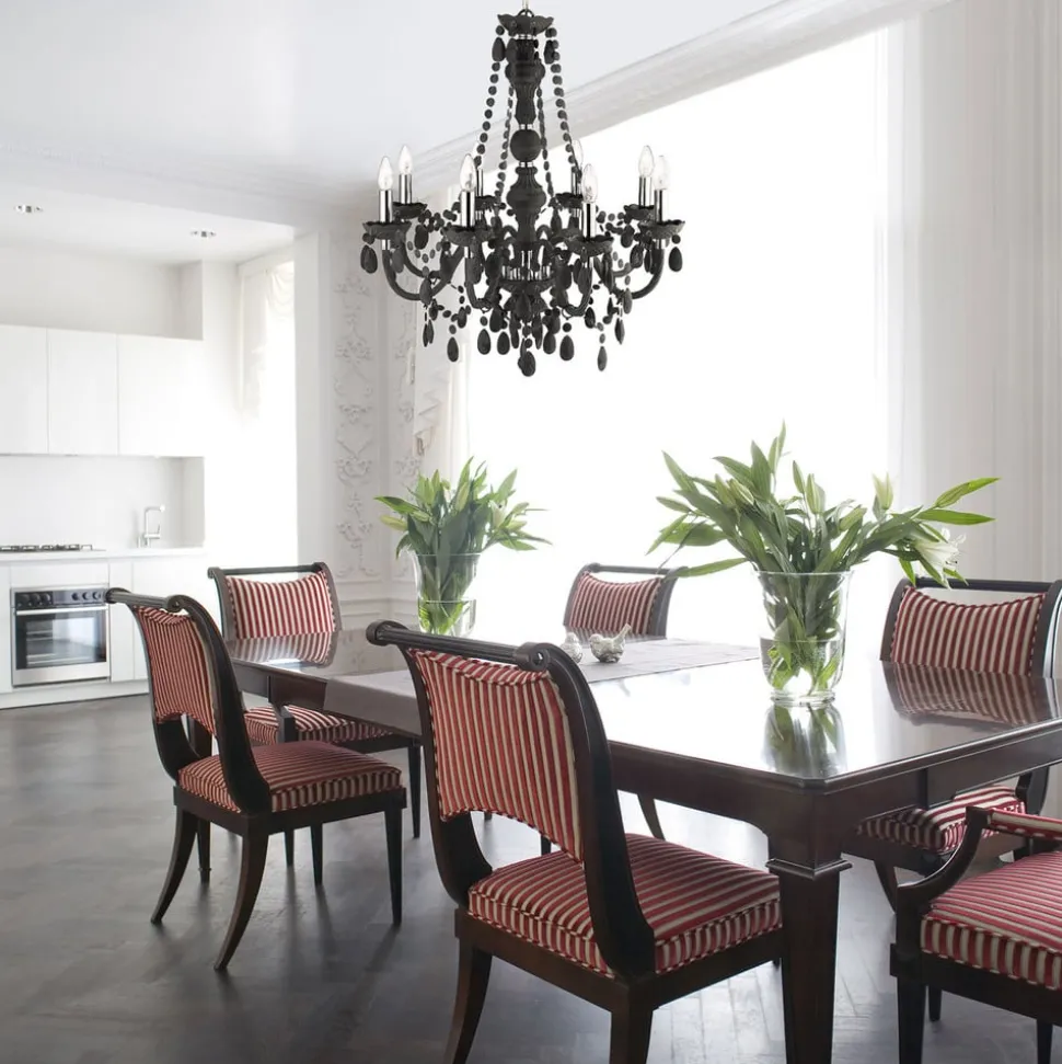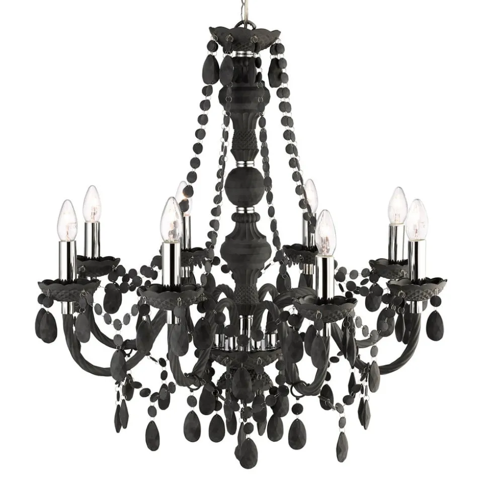 In de ongebruikelijke voor een kroonluchter donkergrijze kleur met een mat oppervlak presenteert de zeer klassiek vormgegeven kroonluchter. Deze contrasten maken van de Marie-Therese-kroonluchter een opvallend element dat het middelpunt van de kamer wordt. Gemonteerd boven een tafel geeft het een mooie algemene verlichting door de bollen (niet inbegrepen) die vrij in de kaarsschachten zitten, wat ook voldoende is voor grotere ruimtes. De Marie-Therese-kroonluchter staat even prachtig in een grote hal of inkomhal. De talrijke ophangingen in de vorm van druppels, platte en ronde elementen van acryl, die gedeeltelijk aan kettingen werden geregen, sieren de achtarmige kroonluchter extra.
