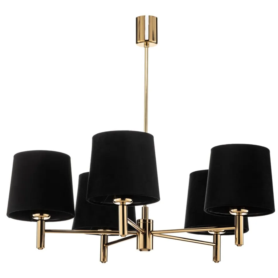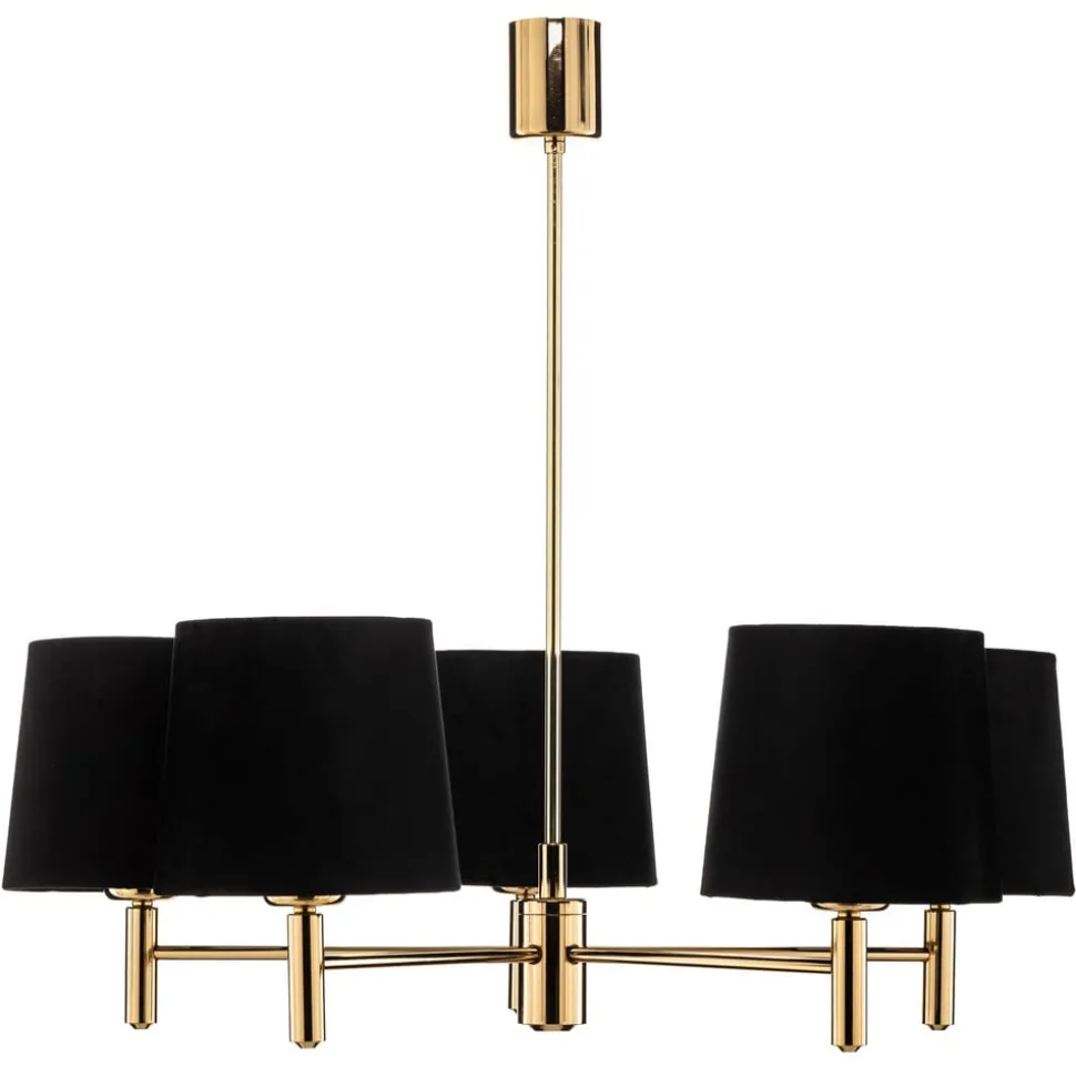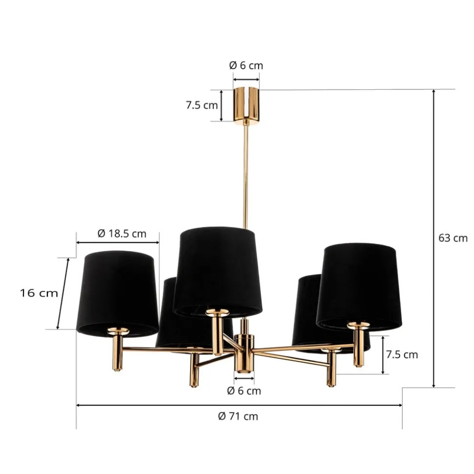 De kroonluchter Polo, 5-lamps, zwart/donker messing, combineert tijdloze elegantie met functionele veelzijdigheid. Hij is gemaakt van hoogwaardig velours en robuust staal en straalt een luxe uitstraling uit die zowel in de woonkamer als in de eetkamer indruk maakt. De combinatie van een zwarte en messingkleurige afwerking geeft de ruimte een elegante en tegelijkertijd moderne uitstraling.