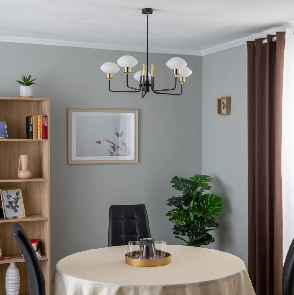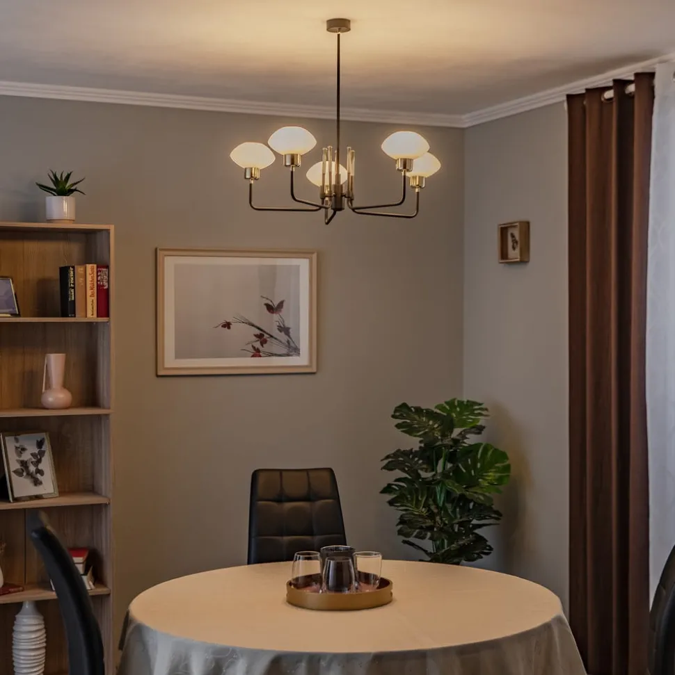 De kroonluchter Ravello, 5-lamps, combineert tijdloze elegantie met hoogwaardige afwerking. Gemaakt van edel metaal en glas, straalt hij in de kleuren wit, zwart en messing een harmonieuze esthetiek uit. Zijn vijf lampen zorgen voor een gelijkmatige en aangename lichtverdeling, die zowel in de woonkamer als in de eetkamer een stijlvolle sfeer creëert.