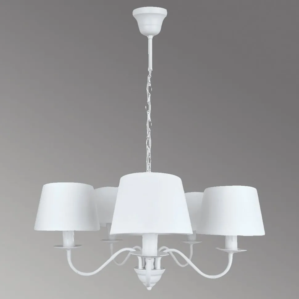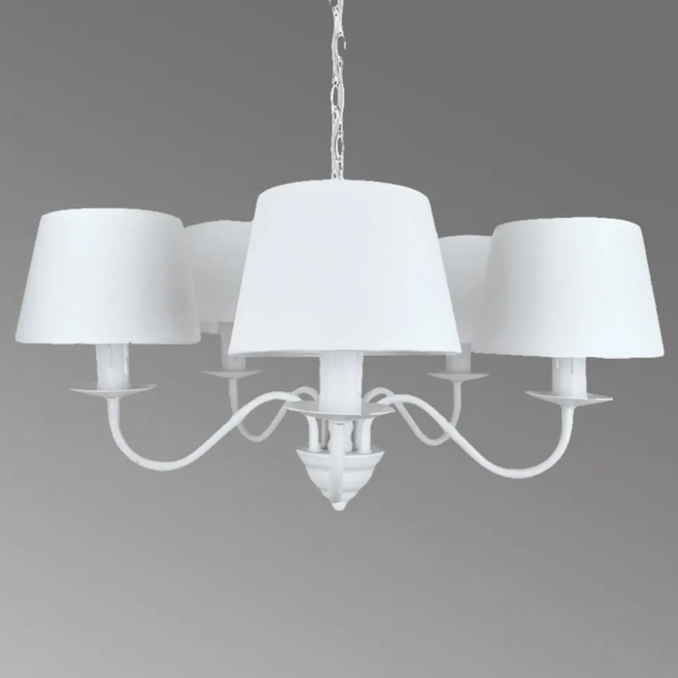 Helemaal in het wit: klassieke kroonluchter Reanna met kleine kapjes De vijf lichtpunten van kroonluchter Reanna zijn voorzien van witte, taps toelopende kapjes die het licht een beetje afschermen zodat het niet verblindt. Het frame is ook wit en heeft een zeer klassieke vorm. Reanna is de perfecte verlichtingsoplossing boven een eet- of keukentafel waar goed algemeen licht nodig is.