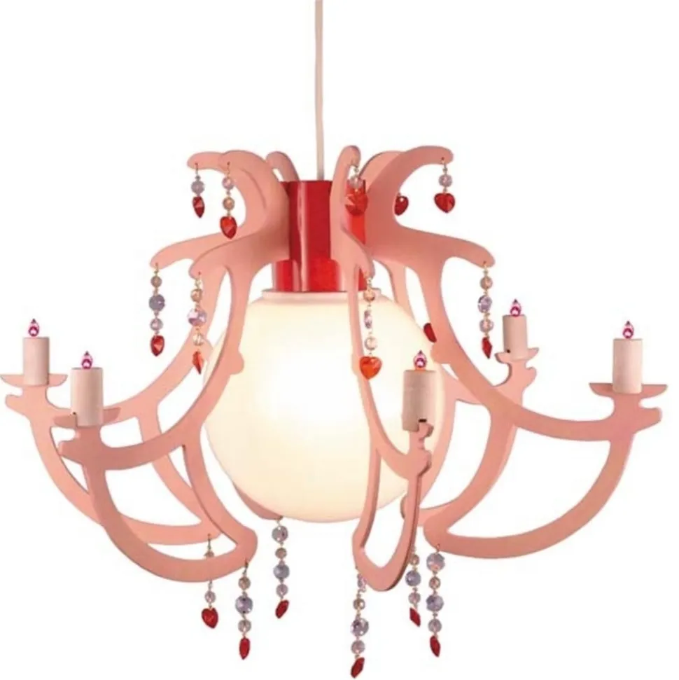 Deze kroonluchter is de kroon op iedere meisjeskamer. Ook overdag trekt ze alle blikken naar zich toe. De armen van de kroonluchter zijn van hout gemaakt en zijn versierd met strass-steentjes en imitatiekaarsen. In het midden bevindt zich een onbreekbare bolvormige lamp. Een lamp waarmee u elk meisje blij kunt maken die zelf in haar dromen ook een echte prinses is.