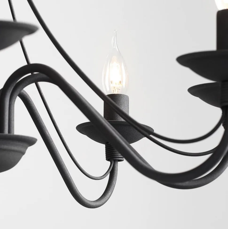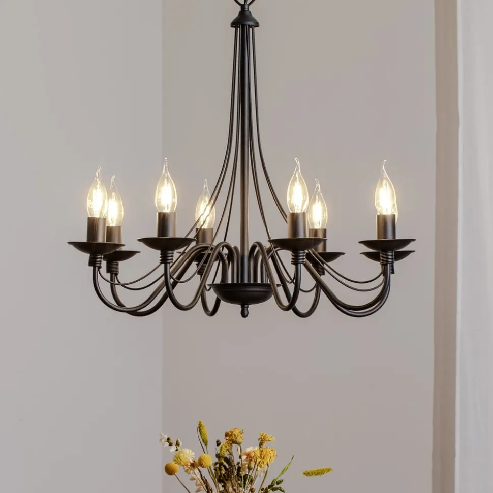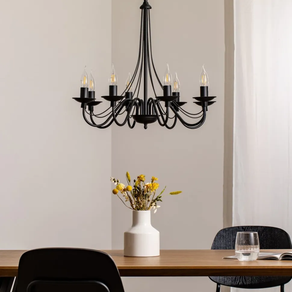 De kroonluchter Rosa valt op door zijn verfijnde combinatie van zwart metaal en een elegant design dat in elke ruimte accenten legt. Met zijn acht armatuur armen zorgt hij voor een gelijkmatige en indrukwekkende lichtverdeling, die zowel in de eetkamer als in de keuken of in de woonkamer een stijlvolle sfeer creëert. De hoogwaardige afwerking en het tijdloze design maken deze kroonluchter tot een duurzame metgezel in elk huis.