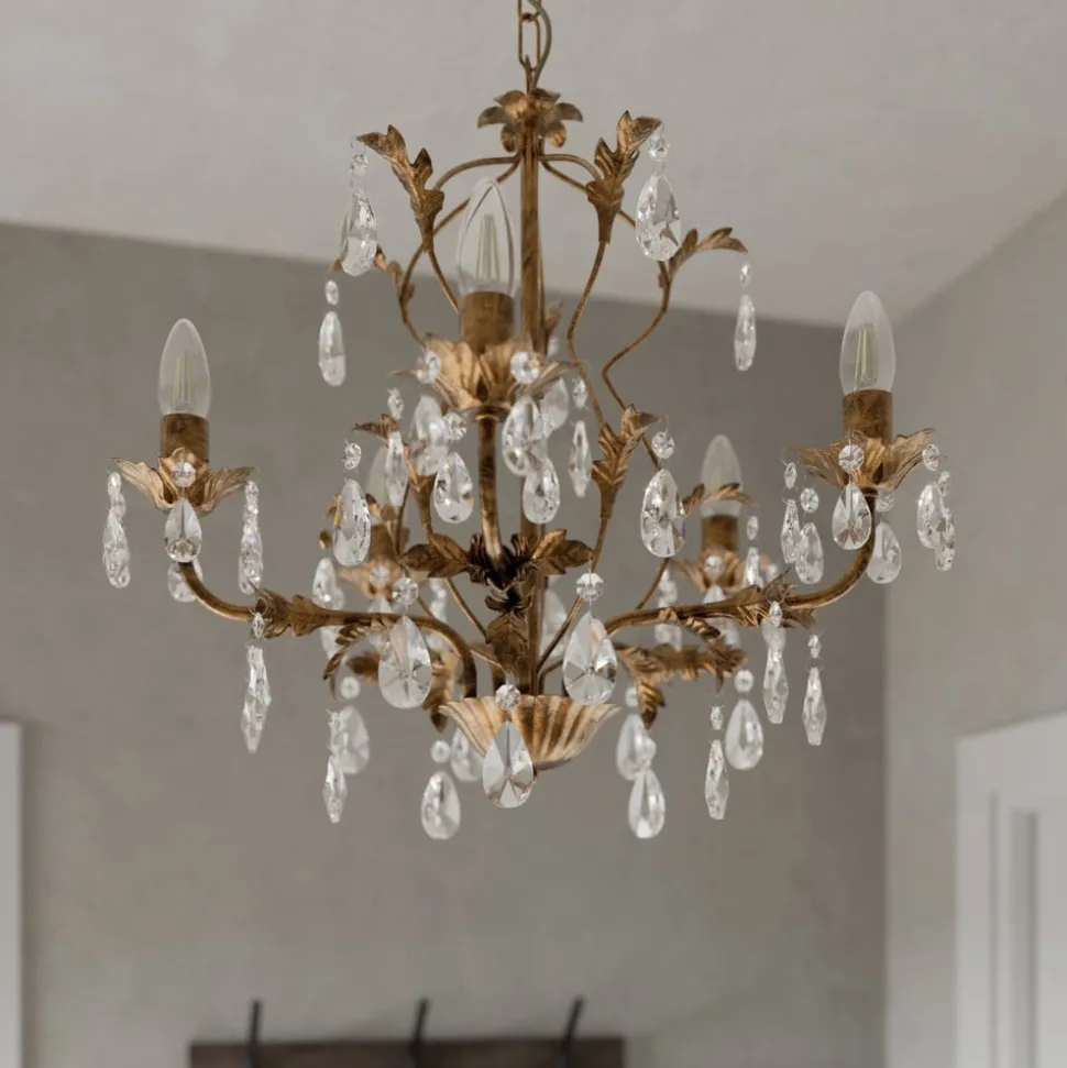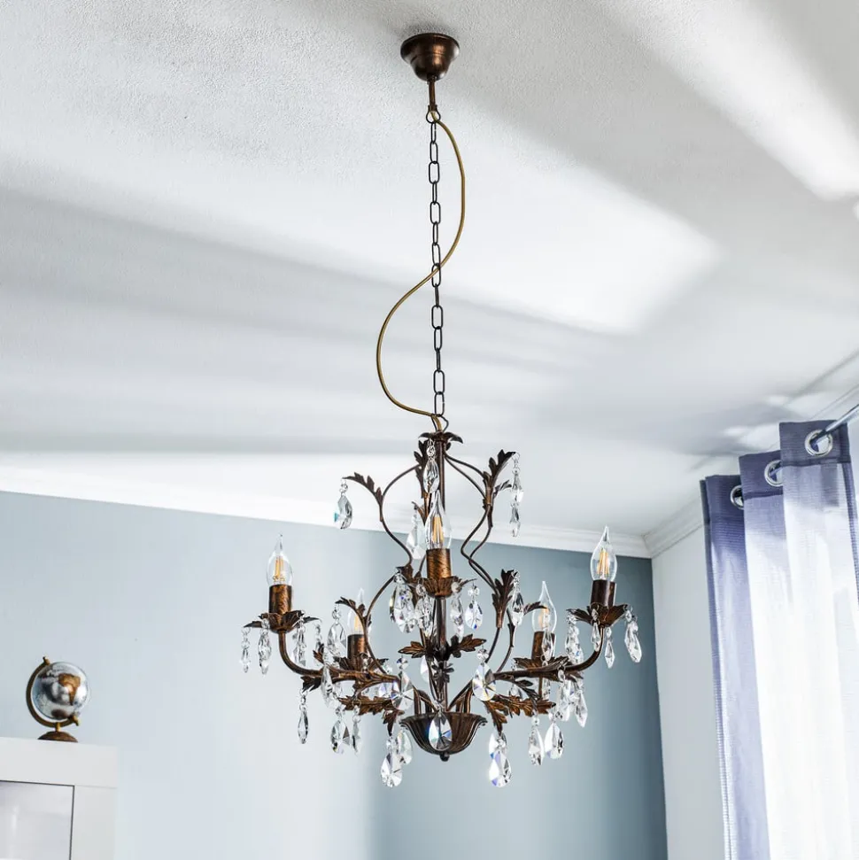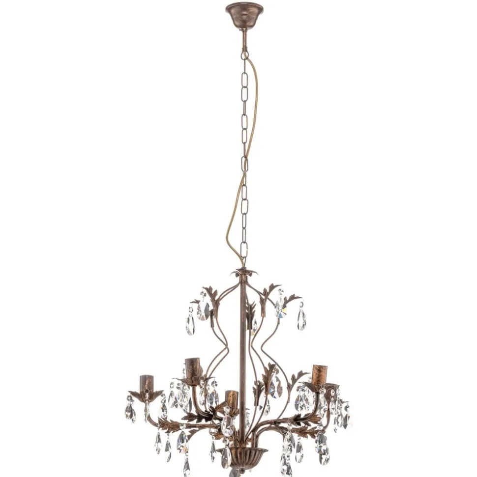 De kroonluchter Teresa met kristallen, 5-lamps, combineert antieke charme met tijdloze elegantie. Gemaakt van gesmeed ijzer en hoogwaardig K9-kristalglas, geeft hij elke ruimte een luxueuze sfeer. De combinatie van een antieke bronzen afwerking en heldere kristallen zorgt voor een fascinerend spel van licht en schaduw, dat zowel in de woonkamer als in de keuken of eetkamer indruk maakt.