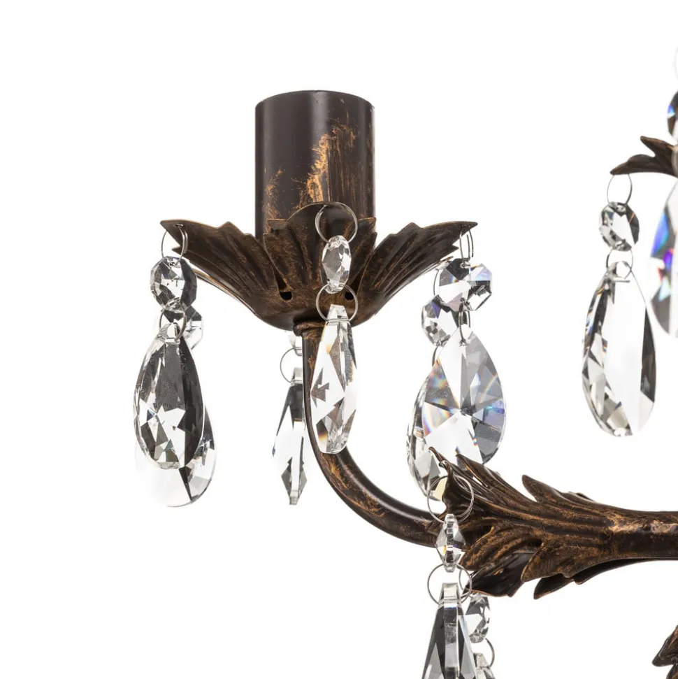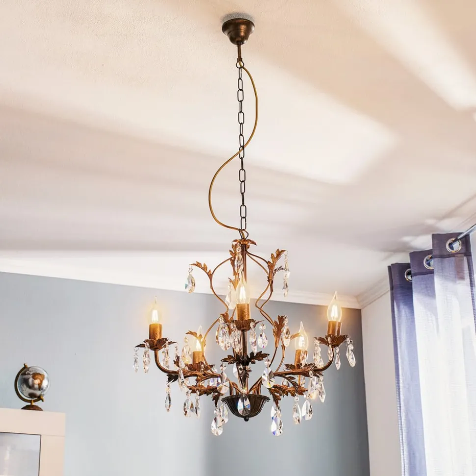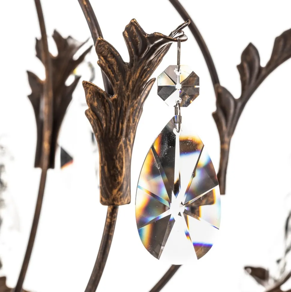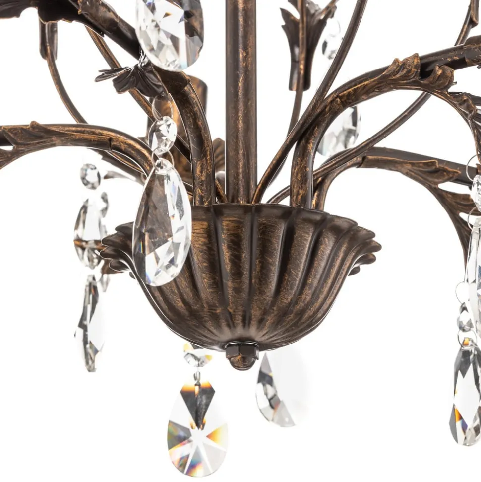 De kroonluchter Teresa met kristallen, 5-lamps, combineert antieke charme met tijdloze elegantie. Gemaakt van gesmeed ijzer en hoogwaardig K9-kristalglas, geeft hij elke ruimte een luxueuze sfeer. De combinatie van een antieke bronzen afwerking en heldere kristallen zorgt voor een fascinerend spel van licht en schaduw, dat zowel in de woonkamer als in de keuken of eetkamer indruk maakt.