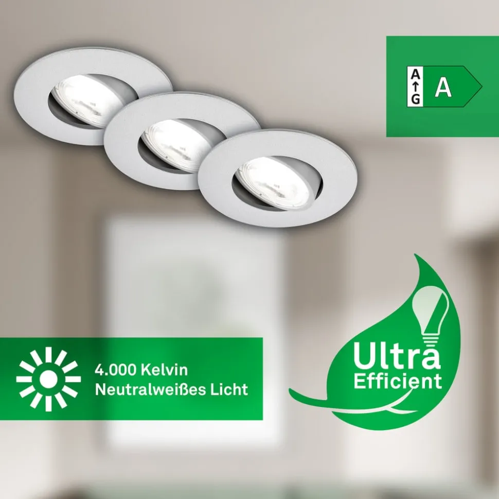 Kulana Een LED-inbouwarmatuurset voor woon- en werkruimten De LED-lichtbronnen in deze modern vormgegeven armatuurset creëren niet alleen een aangename sfeer, maar zorgen ook voor energiezuinige verlichting. Met de mogelijkheid om de inbouwlampen te draaien, kunt u het licht precies richten waar het nodig is om een inspirerende omgeving te creëren of de productiviteit te verhogen. De 3-delige set biedt een uniforme oplossing voor verfijnde ruimteverlichting die zowel functioneel als esthetisch aangenaam is. De lichttemperatuur van 4.000 Kelvin zorgt voor een helder, neutraal licht dat ideaal is voor geconcentreerd werken of een heldere waarneming van de ruimte. De moderne stijl benadrukt ook het eigentijdse design van je interieur.