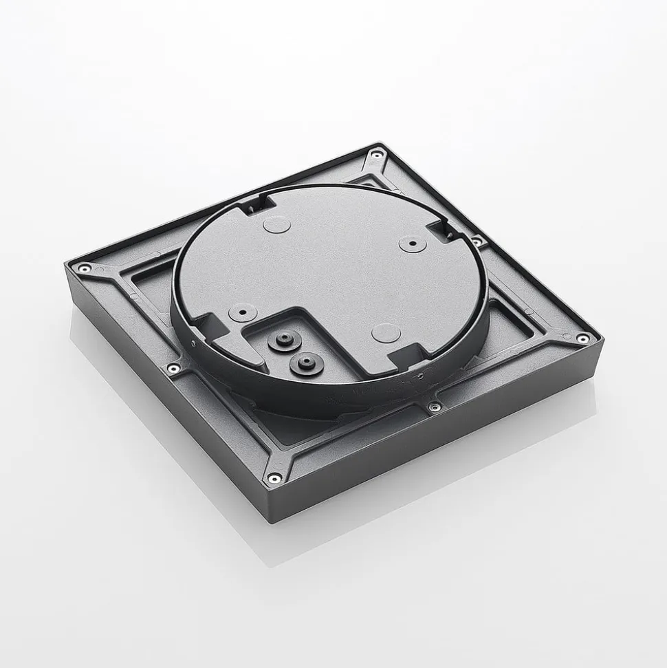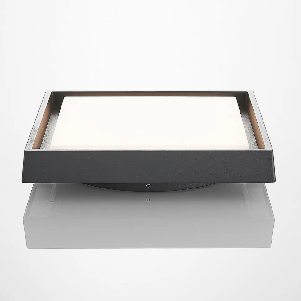 Optimale lichtverstrooiing wordt bereikt door de geïntegreerde polycarbonaat-diffuser. Deze is geplaatst in een vierkant aluminium montuur, waardoor een stabiel armatuur ontstaat. De buitenlamp is in een eenvoudig en modern donkergrijs gehouden. Bovendien wordt ze gekenmerkt door geringe hoogte, zodat ze weinig ruimte inneemt en naadloos aansluit aan het plafond.