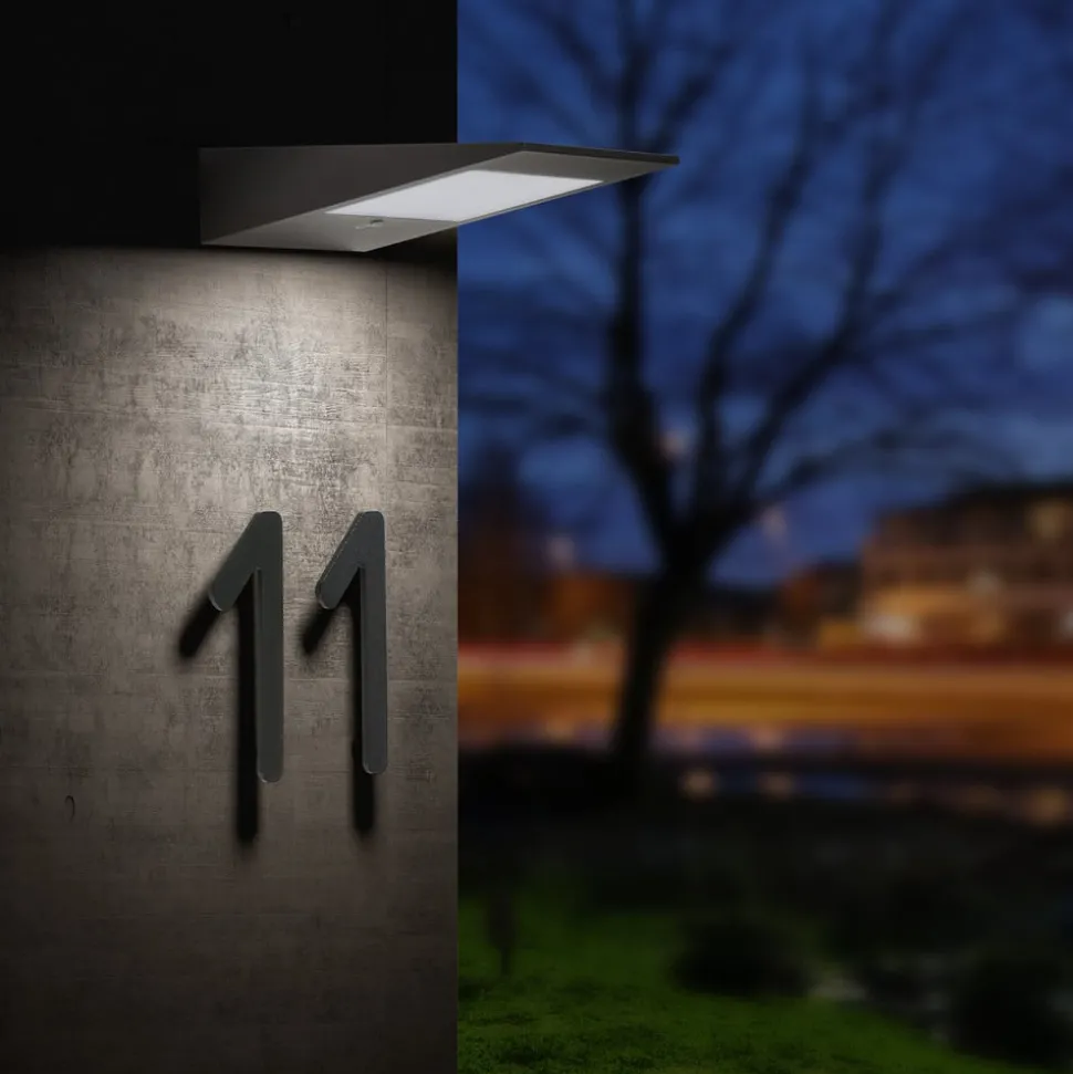 De uiterst praktische LED buitenwandlamp 9019 werkt op zonne-energie en heeft daarom geen eigen stroomvoorziening nodig. Het kan dus in bijna elk gebied van de buiteninstallatie worden geïnstalleerd, of het nu op het terras, in de garage of bij de ingang van het huis is. De aluminium behuizing is uitgevoerd in donker antraciet en heeft aan de onderzijde een kunststof diffuser met daarin de warm wit glanzende LEDs. Het zonnepaneel is aan de bovenzijde gemonteerd. De CMD 9019 buitenwandlamp, die dus naar beneden schijnt, is geschikt om bijvoorbeeld het huisnummer permanent te verlichten, omdat de nachtlampfunctie een permanent gedimd licht geeft. Wanneer er beweging wordt gedetecteerd, schakelt de geïntegreerde sensor het licht gedurende ca. 30 seconden naar een volledig vermogen (100%) en dimt het vervolgens weer naar de nachtmodus.