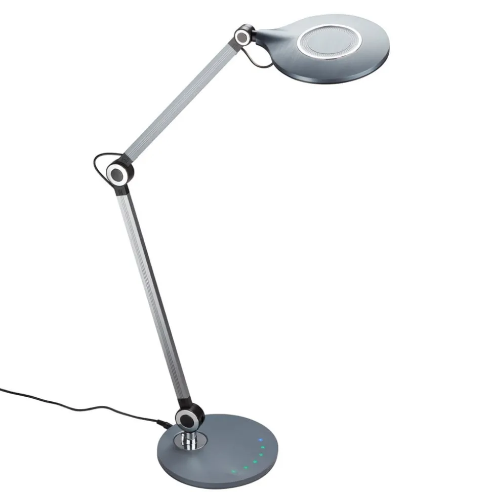 Deze LED-bureaulamp heeft een modern design en past moeiteloos in modern ingerichte kantoren of thuiskantoren. De behuizing is van kunststof en de ronde lampenkap kan vrij worden gedraaid en gezwenkt. Met de twee beweegbare armen kan ook de lichtinval aan elke situatie worden aangepast. Via touch dimmer kan de lichtopbrengst traploos worden gedimd om de helderheid aan te passen aan elke situatie – of het nu gaat om computerwerk of het lezen van bestanden. Bovendien maakt de tafellamp een drietraps verandering van de kleurtemperatuur mogelijk.