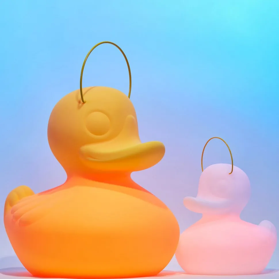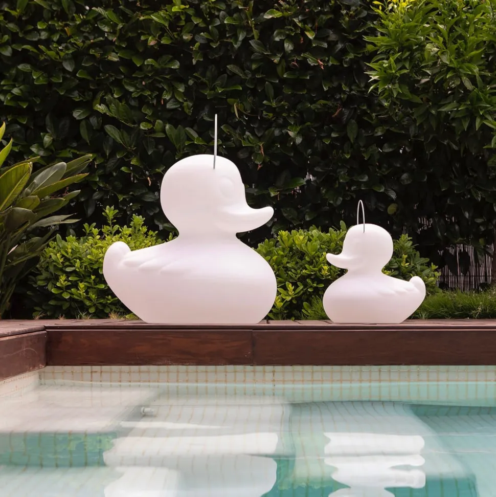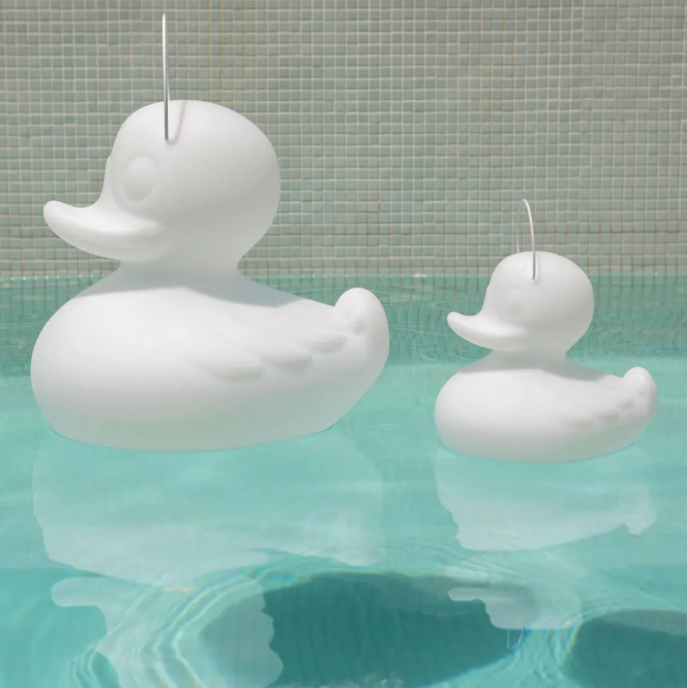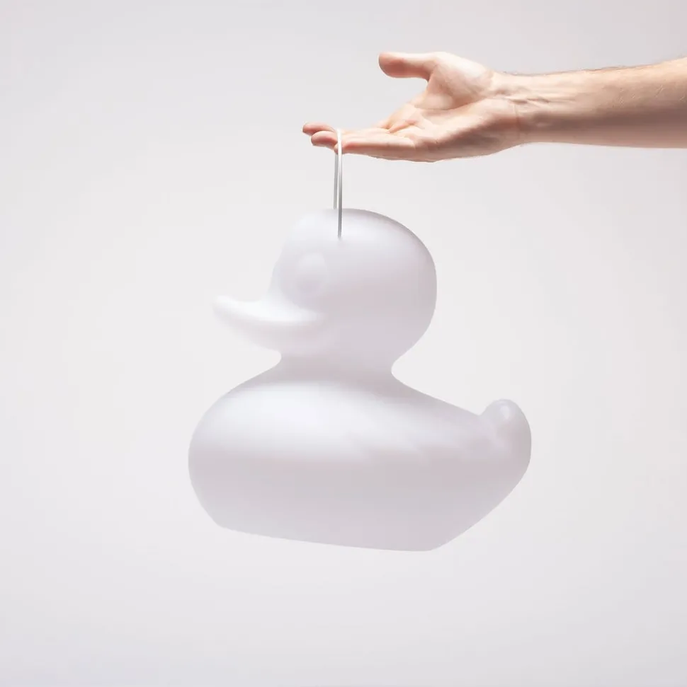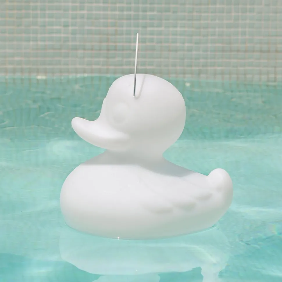 Drijvende eend met effectieve verlichting – LED designlamp DUCK-DUCK S Of het nu voor privé- of commerciële buitenruimtes is, de moderne decoratieve lamp DUCK-DUCK S brengt creatief design in elke tuin. De vorm brengt zowel volwassenen als kinderen in verrukking, omdat het armatuur doet denken aan de klassieke badeend die in elk bad niet mag ontbreken. DUCK-DUCK S is nu de eend voor het buitenzwembad: het is drijvend, stoot- en breukvast en UV-bestendig en kan daarom zonder aarzeling buiten worden gebruikt. De geïntegreerde LED’s worden aangestuurd door een meegeleverde infrarood afstandsbediening, waarmee de lichtsterkte in drie standen kan worden geschakeld en de lichtkleur kan worden geselecteerd. De DUCK-DUCK S kan ook worden in- en uitgeschakeld met de schakelaar aan de onderkant van de decoratielamp zelf. Een geïntegreerde oplaadbare batterij zorgt voor een verlichtingsduur van meerdere uren, die kan variëren afhankelijk van het helderheidsniveau. Een inductielaadstation, dat wordt meegeleverd, zorgt voor gemakkelijk opladen. De DUCK-DUCK S LED designlamp heeft ook een praktische draaggreep in de vorm van een stevige, afneembare metalen beugel op de kop van de eend. Het ontwerp van de DUCK-DUCK S LED decoratielamp is afkomstig van de Engelse ontwerper Marke Newton, die dit product voor Goodnight Light ontwierp.- Oplaadtijd van de batterij ca. 6 uur- Lichtduur ca. 7-10 uur