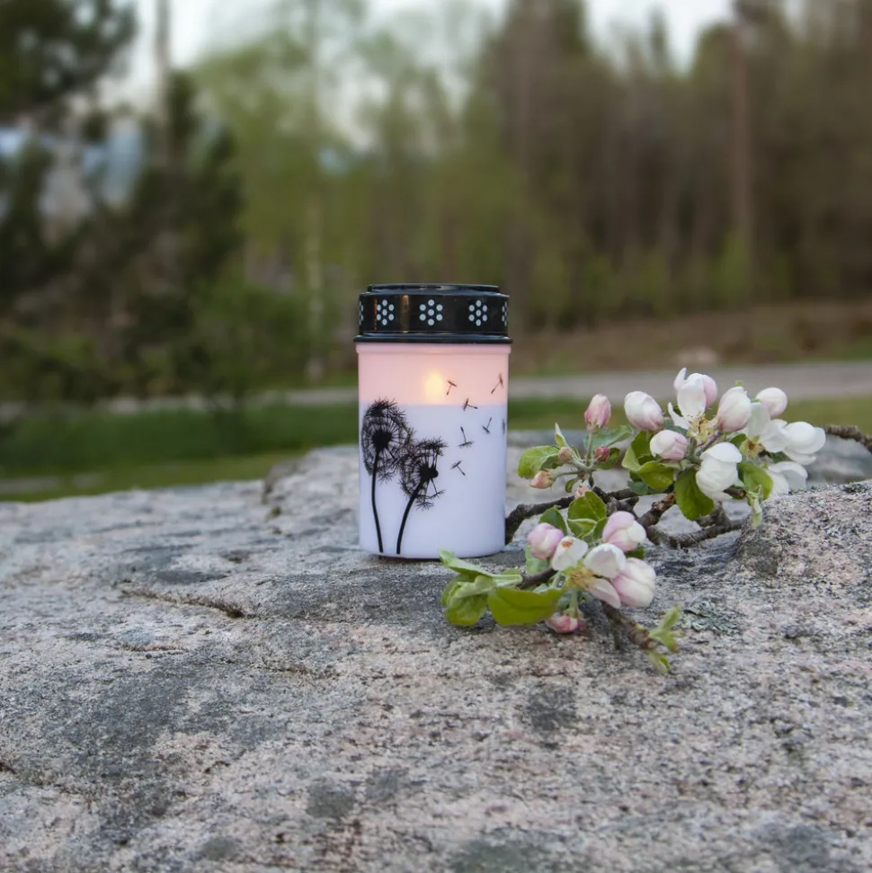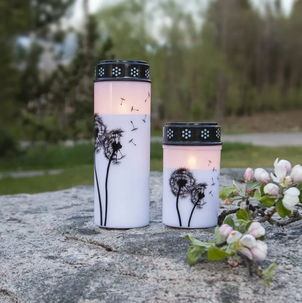 LED graflamp Dandelion met timerfunctie Dandelion is speciaal bedoeld voor grafdecoratie. De cilindervormige LED-graflamp is gemodelleerd naar een klassieke grafkaars met een witte kunststof behuizing en zwarte deksel. Het motief van zwarte paardenbloemen siert de buitenkant. De spatwaterdichte (IP44) LED-grafverlichting kan permanent buiten worden gebruikt en werkt op batterijen (2 x C, exclusief). De timerfunctie (6 uur aan, 18 uur uit) maakt automatisch schakelen mogelijk.