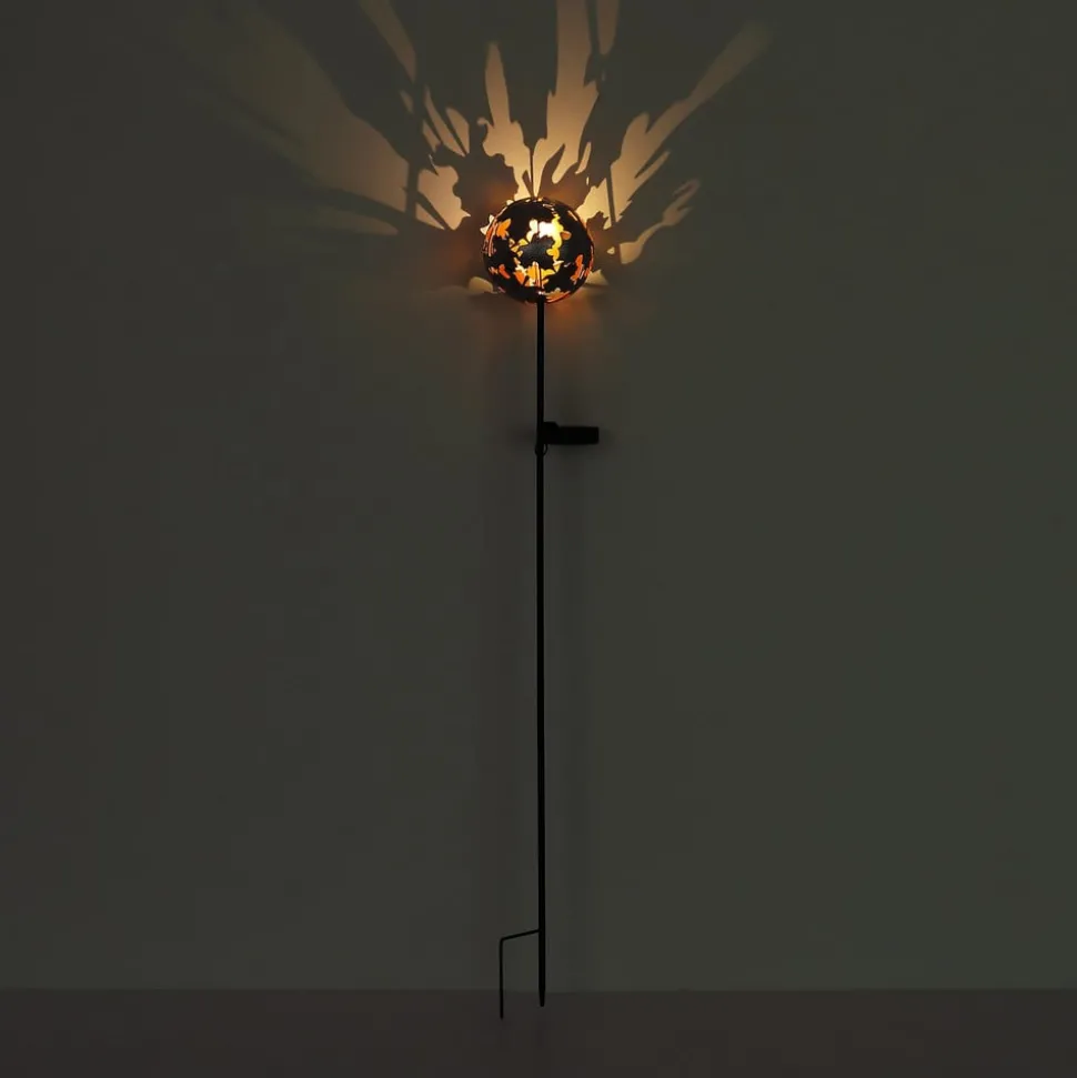 LED lamp op zonne-energie 36747 in bolvorm met grondspies De kap van deze solarlamp met lange grondspies is ontworpen in de vorm van vele esdoornbladeren die een bol vormen. De warmwitte LED in de bol zorgt voor geweldige lichteffecten.