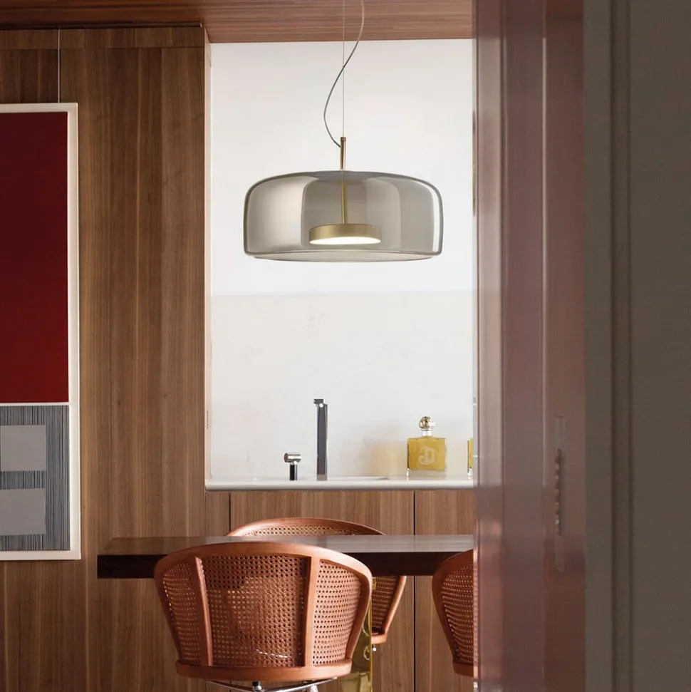 De Jube LED hanglamp, die de Italiaanse ontwerpers Favaretto & Partner de Archiproducts Design Award 2017 heeft gewonnen, overtuigt met zijn edele dubbele uitstraling, gekleurd transparant glas en het daaruit voortvloeiende vintage karakter, dat weer volledig in lijn is met de trend.