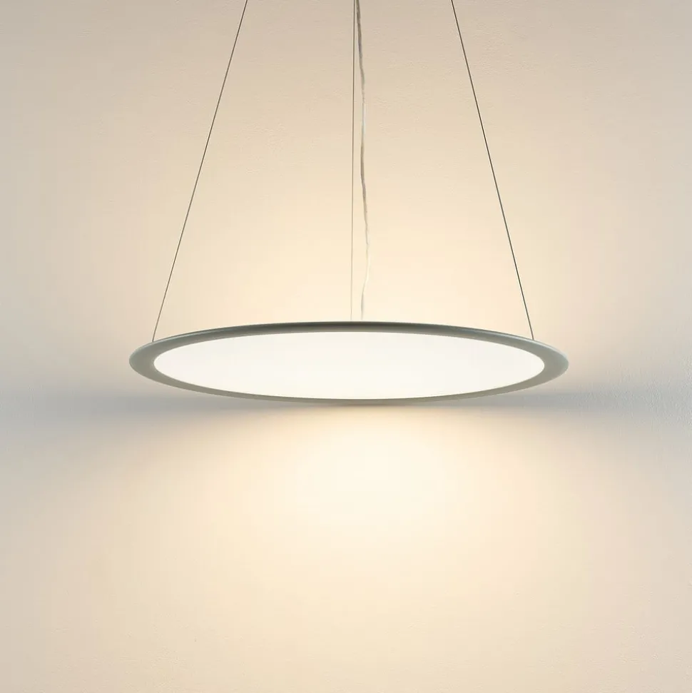 Vlakke, ringvormige LED paneellamp PANEL voor directe en indirecte verlichting De LED paneellamp PANEL zorgt voor een uitgebreide algemene verlichting, vooral in moderne kantoren en bedrijfsruimten. Het ringvormige lichaam van de hanglamp is gemaakt van aluminium en is aan de binnenkant voorzien van LED’s. Hun licht wordt naar de bijna transparante acrylschijf geleid. Hun licht wordt naar de bijna transparante acrylschijf geleid, die voor een brede verdeling naar boven en beneden zorgt – Lichttemperatuur kan in drie stappen worden geselecteerd voordat de lamp in gebruik wordt genomen: 3.000 K / 3.500 K / 4.000 K – Extern dimbaar (faseafsnijdingsregeling, faseafsnijdingsregeling) – Inclusief baldakijn, LED driver en drie ophangkabels