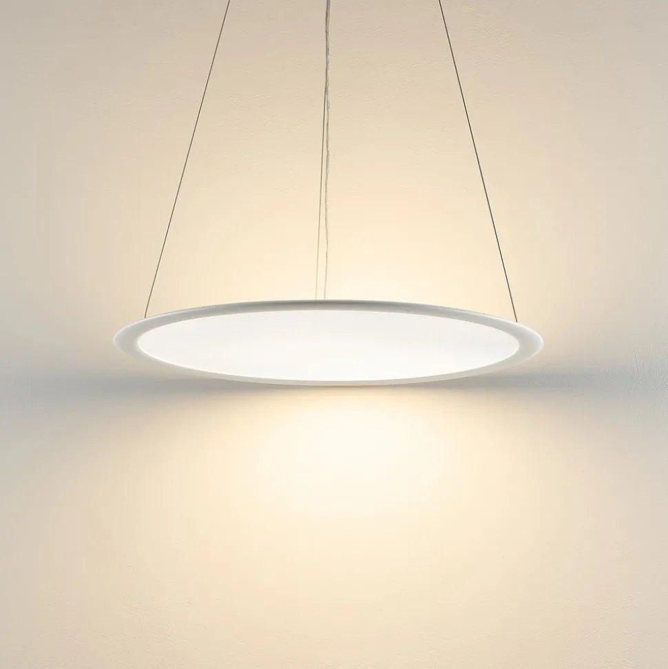 Vlakke, ringvormige LED paneellamp PANEL voor directe en indirecte verlichting De LED paneellamp PANEL zorgt voor een uitgebreide algemene verlichting, vooral in moderne kantoren en bedrijfsruimten. Het ringvormige lichaam van de hanglamp is gemaakt van aluminium en is aan de binnenkant voorzien van LED’s. Hun licht wordt naar de bijna transparante acrylschijf geleid. Hun licht wordt naar de bijna transparante acrylschijf geleid, die voor een brede verdeling naar boven en beneden zorgt – Lichttemperatuur kan in drie stappen worden geselecteerd voordat de lamp in gebruik wordt genomen: 3.000 K / 3.500 K / 4.000 K – Extern dimbaar (faseafsnijdingsregeling, faseafsnijdingsregeling) – Inclusief baldakijn, LED driver en drie ophangkabels