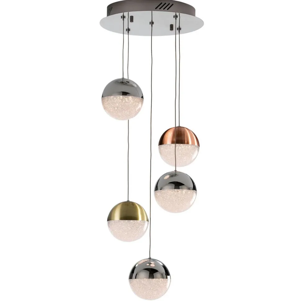 Bij de LED-pendelarmatuur Sphere hangen vijf afzonderlijke lampen met bolvormige kappen van polycarbonaat aan een ronde, verchroomde kap naar beneden. De kappen zijn deels wit gestructureerd, deels met een afwerking in gesatineerd koper, gesatineerd messing of chroom. Zo ontstaat bij het inschakelen van het licht een fascinerend lichteffect dat rondom zichtbaar is. Ook in uitgeschakelde toestand is de LED-pendelarmatuur Sphere een decoratief en stijlvol element in moderne woonruimtes.