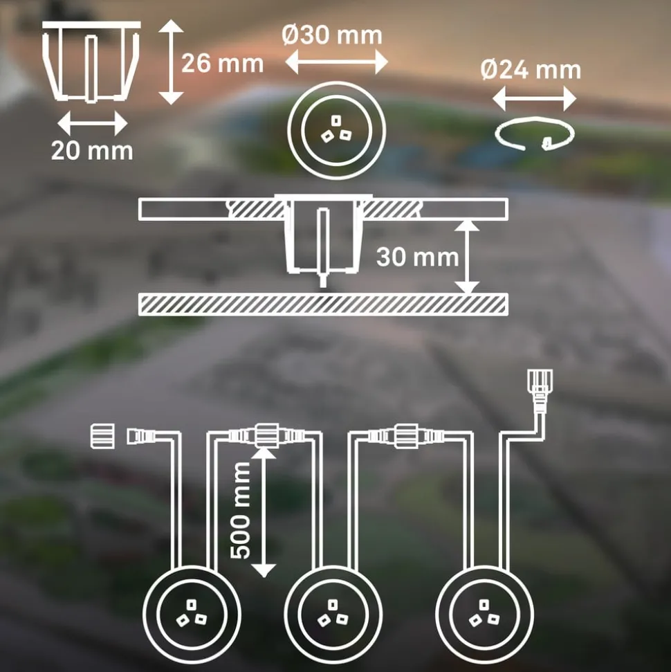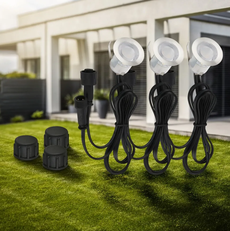 Uitbreidingsset voor 12 V buitenverlichting – drie ronde LED inbouwspots Ø 3 cm van roestvrij staal Deze set met drie warmwitte LED inbouwspots wordt gebruikt om de 12 V buitenlamp van Briloner uit te breiden. De ronde spots zijn voorzien van een roestvrijstalen behuizing en een kunststof deksel en hebben geschikte aansluitkabels met stekkerverbindingen voor het 12 V-systeem. Een buitenstekkertransformator voor 230 V aansluiting op het stopcontact is niet inbegrepen – een startset (zie accessoires) is vereist – Uitbreidingsset met drie lampen en 12 V aansluitkabels – Exclusief stekkertransformator – Beschermingsgraad: IP67