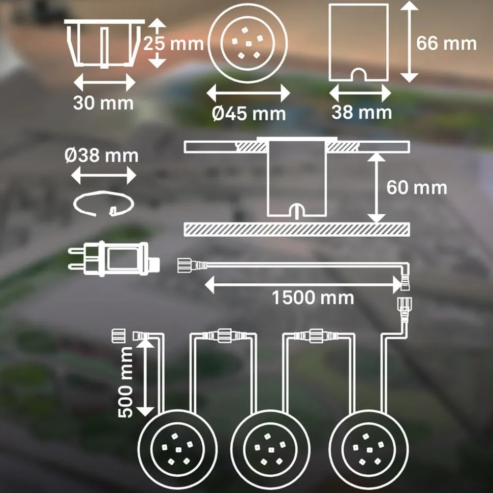 - drie inbouwlampen (12 V) met ingangskabel (12 V) en uitgangskabel (12 V), één externe plug-in voedingseenheid (230 V) met uitgangskabel (12 V), drie inbouwpotten