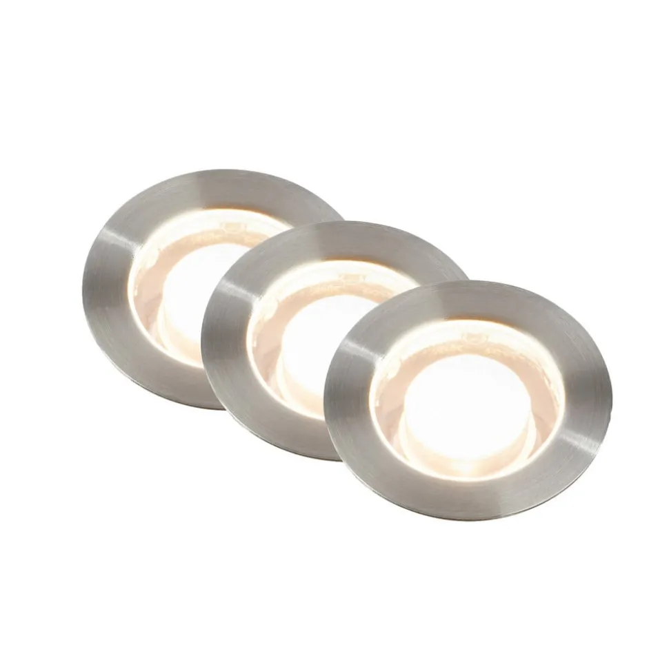 Uitbreidingsset voor 12 V buitenverlichting – drie ronde LED inbouwspots Ø 4,5 cm van roestvrij staal met montagehulzen Deze set met drie warmwitte LED inbouwspots wordt gebruikt om de 12 V buitenlamp van Briloner uit te breiden. Dankzij de meegeleverde installatiebussen zijn de spots ook optimaal beschermd in een vochtige ondergrond. De ronde spots zijn voorzien van een roestvrijstalen behuizing en een kunststof deksel en hebben geschikte aansluitkabels met stekkerverbindingen voor het 12 V-systeem. Een buitenstekkertransformator voor 230 V aansluiting op het stopcontact is niet inbegrepen – een startset (zie accessoires) is vereist – Uitbreidingsset met drie lampen en 12 V aansluitkabels – Exclusief stekkertransformator – Met installatiehulzen voor montage in gazons e.d. – Beschermgraad: IP67