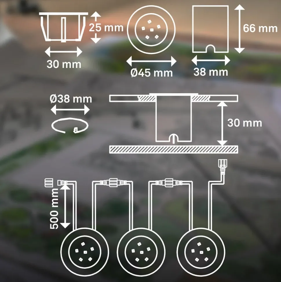 - drie inbouwlampen (12 V) met ingangskabel (12 V) en uitgangskabel (12 V), drie inbouwpotten