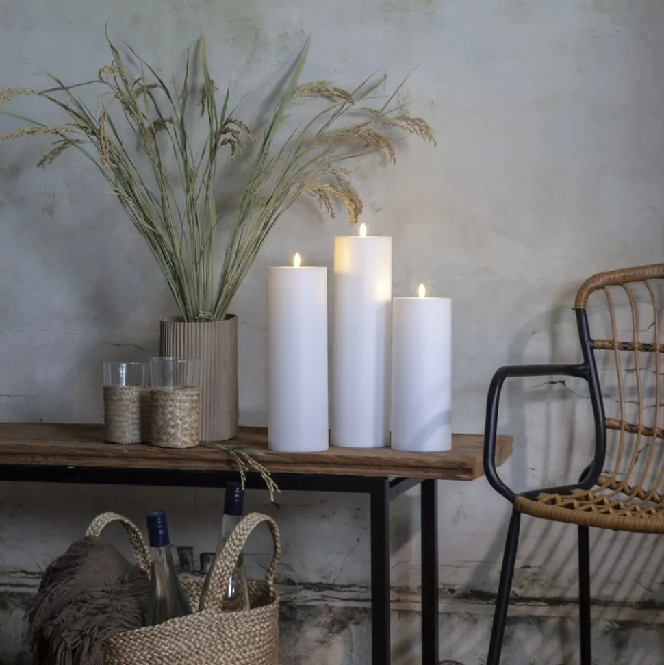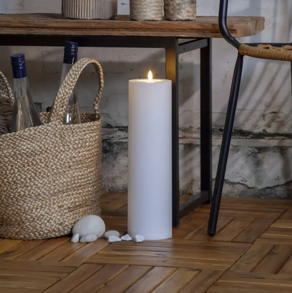 LED-decoratiekaars Flamme Rak op batterijen voor binnen en buiten – met sensor en timerfunctie De LED-kaars Flamme Rak is een praktische keuze voor kerst- of feestdecoraties in en rond het huis. De decoratieve kaars van wit kunststof is beschermd tegen spatwater (IP44). Hij werkt op drie AA-batterijen (niet meegeleverd) en kan daarom overal worden geplaatst. Hij kan automatisch worden ingeschakeld – met een timer (6 uur aan, 18 uur uit) of schemersensor.