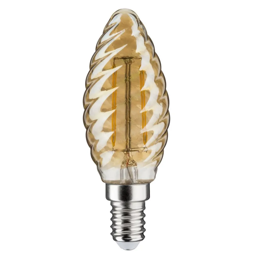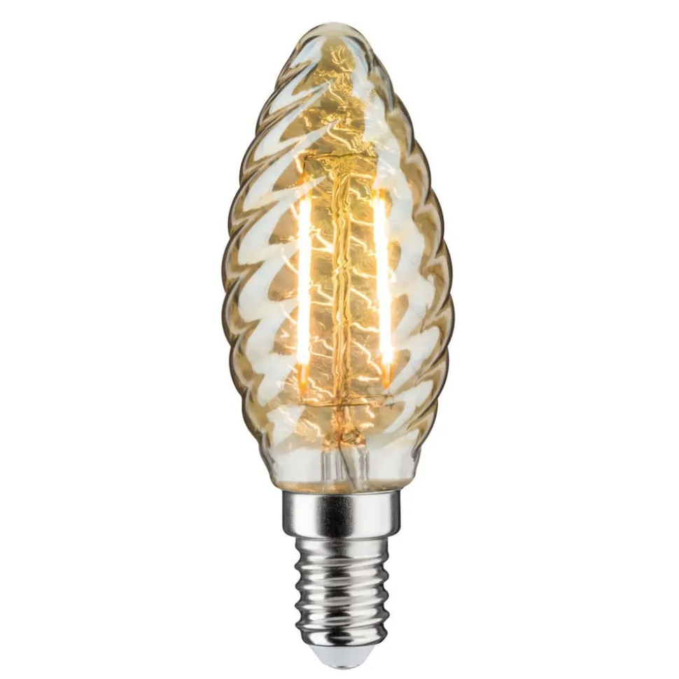 Gedraaide LED kaarslamp E14 met goudkleurig glas en extra warm lichttemperatuur 2.500K