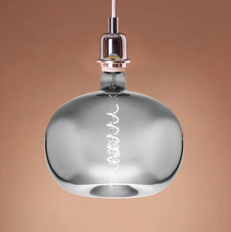 LED lamp E27 4W Big Size in de vorm van een appel Deze grote LED lamp met E27 lampvoet is een blikvanger in alle open armaturen. Ze heeft de vorm van een appel, het glas is verchroomd maar toch transparant, zodat de LED-filamenten, prachtig gerangschikt in een spiraalvorm, zichtbaar zijn wanneer ze worden ingeschakeld en het best tot hun recht komen – dimbaar met veel gangbare dimmers zoals Busch, Gira, Jung, Siemens en nog veel meer.