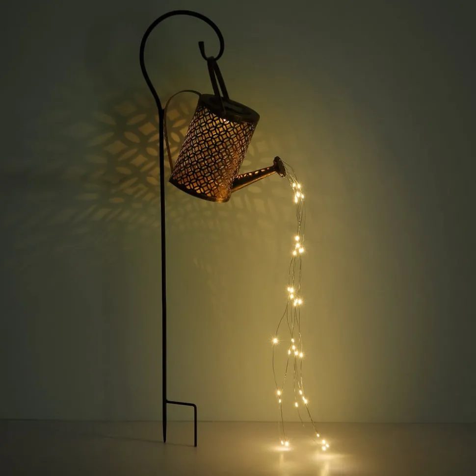 LED lamp op zonne-energie 33652/336523 – Gieter, LED grondspies lamp Elke tuin kan worden versierd met deze effectieve LED lamp op zonne-energie. De metalen gieter, die aan een hoge grondspies hangt, is uitgerust met LED lichtkettingen die de waterstraal imiteren en voor een geweldig effect oplichten en flikkeren.