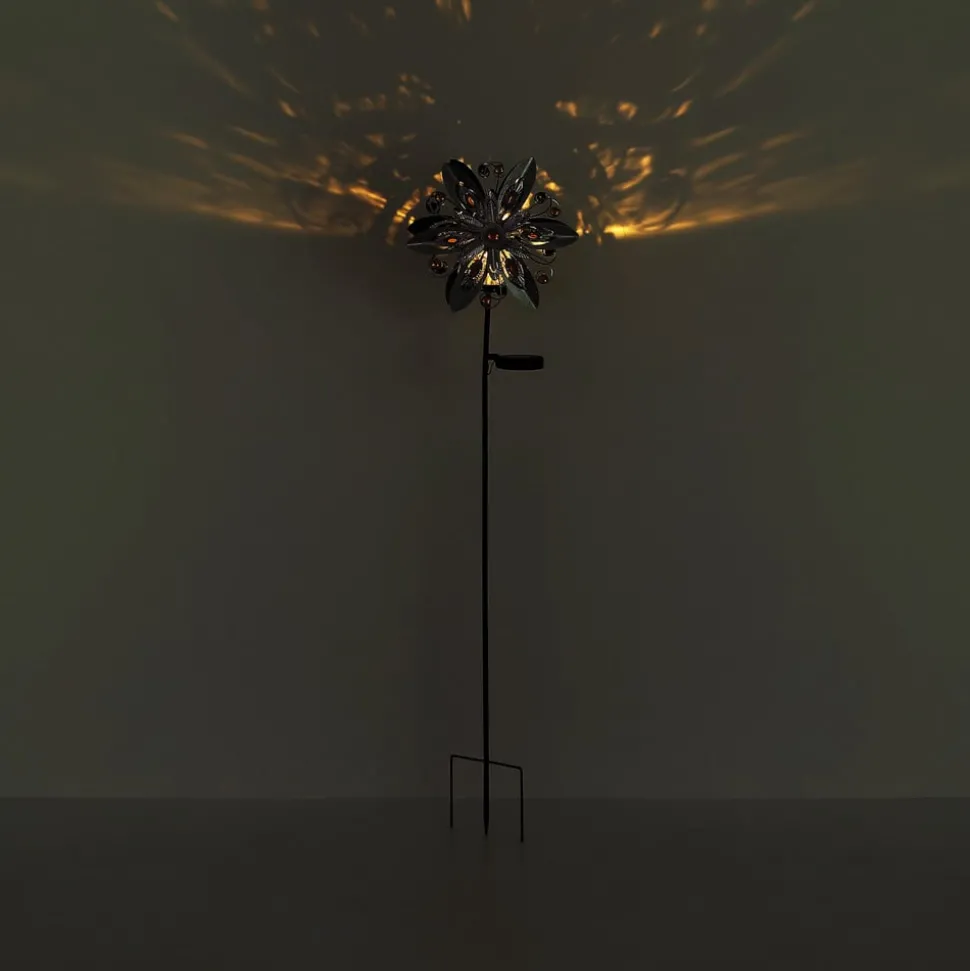 LED lamp op zonne-energie 36578S in bloemmotief met grondspies Deze solarlamp met grondspies in een filigraan bloemmotief bestaat uit twee metalen bloemen met een zilveren oppervlak aan de voorkant en een zwart oppervlak aan de achterkant, die versierd zijn met gele glassteentjes. Tussen de twee bloemen bevindt zich een heldere glazen bol met een warmwitte LED – met schakelaar op de zonnemodule