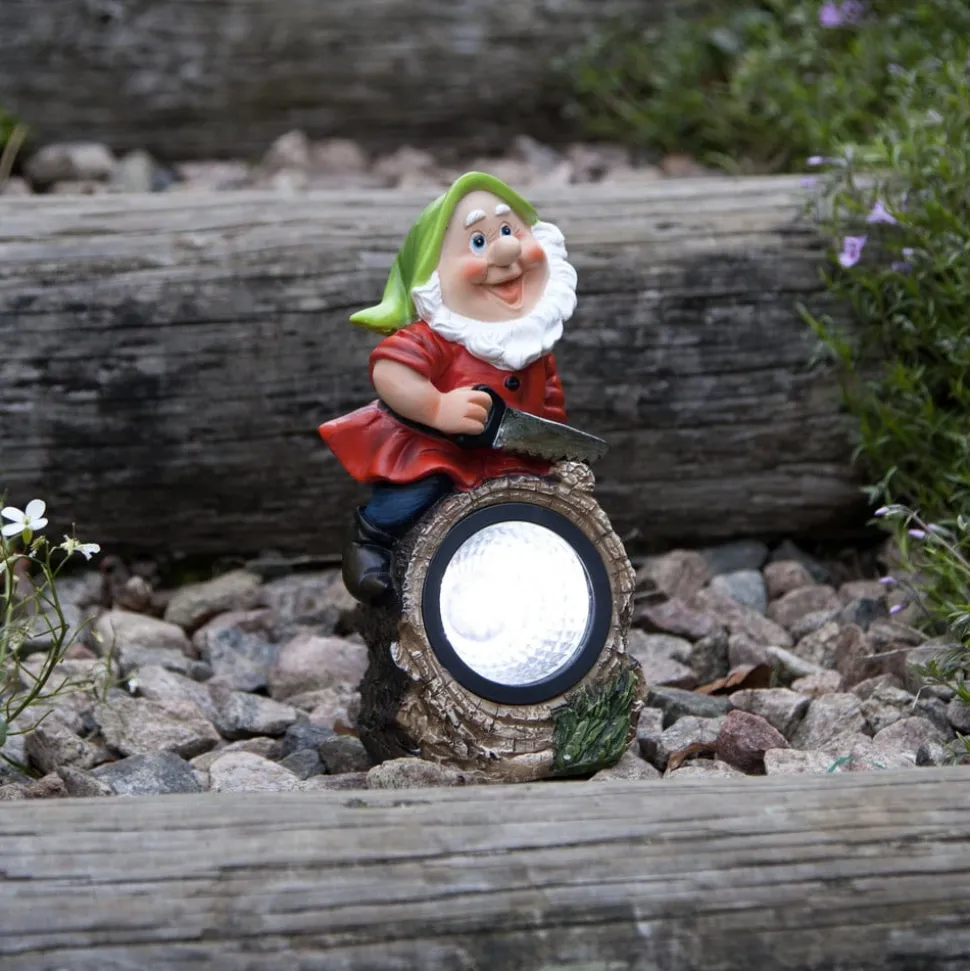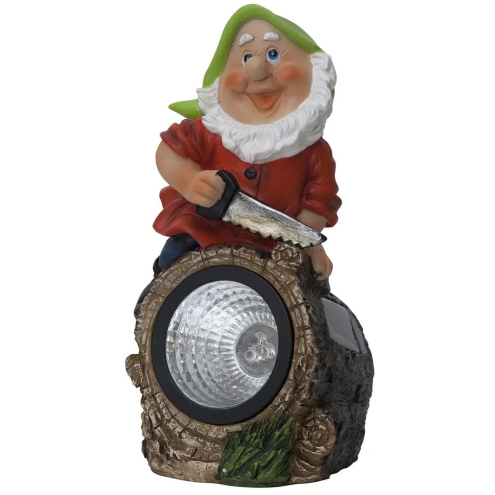 Gnomy decoratieve LED lamp op zonne-energie als houthakker met zaag en boomstam De Gnomy LED lamp op zonne-energie is een kleurrijke tuinkabouter met een zaag in zijn hand, alsof hij elk moment kan beginnen zagen om grip te krijgen op de boomstam waarop hij is neergestreken. In de dwarsdoorsnede van de boomstam zit een LED lamp die ’s nachts wordt ingeschakeld door de schemersensor dankzij de geïntegreerde batterij. Overdag wordt de batterij opgeladen door het ingebouwde zonnepaneel, dat tot zes uur verlichting biedt als het volledig is opgeladen. De sfeerlamp is een geweldige blikvanger voor de voortuin en dankzij de oplaadbare batterij en geïntegreerde zonnemodule is er geen externe voeding nodig.