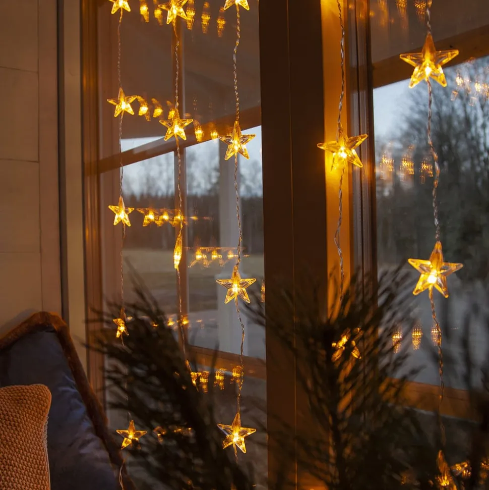 Sfeervol lichtgordijn Star Curtain met warm wit schijnende sterrenHet LED lichtgordijn Star Curtain bestaat uit vijf strengen, aan elk waarvan op regelmatige afstanden zes kleine, transparante sterren zijn bevestigd. Ze zijn voorzien van warmwitte LED’s, die met hun 2.000 Kelvin een zeer gezellig licht produceren.De lichtketting is een sfeervolle raamdecoratie voor de kerstperiode. Hij wordt geleverd inclusief voedingskabel, stekker en binnentransformator (5V DC 1,5W IP20 Eurostekker) en kan moeiteloos worden aangesloten.